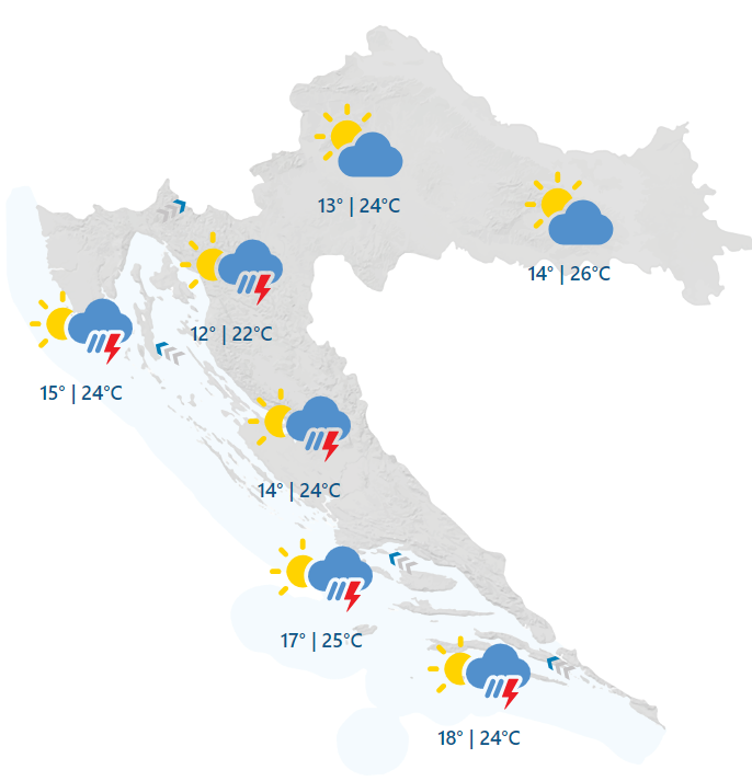 Promjenljivo i nestabilno čeka nas pak sutra. Uz umjeren i jak razvoj oblaka mjestimice će biti kiše i pljuskova s grmljavinom, osobito na Jadranu i krajevima uz Jadran. Vjetar na kopnu većinom slab jugozapadni, uz obalu umjereno do jako jugo, najniže jutarnja temperatura od 10 do 15, na moru između 14 i 19, a najviša dnevna uglavnom od 22 do 27 °Celzija, prognozira Državni hidrometeorološki zavod (DHMZ).