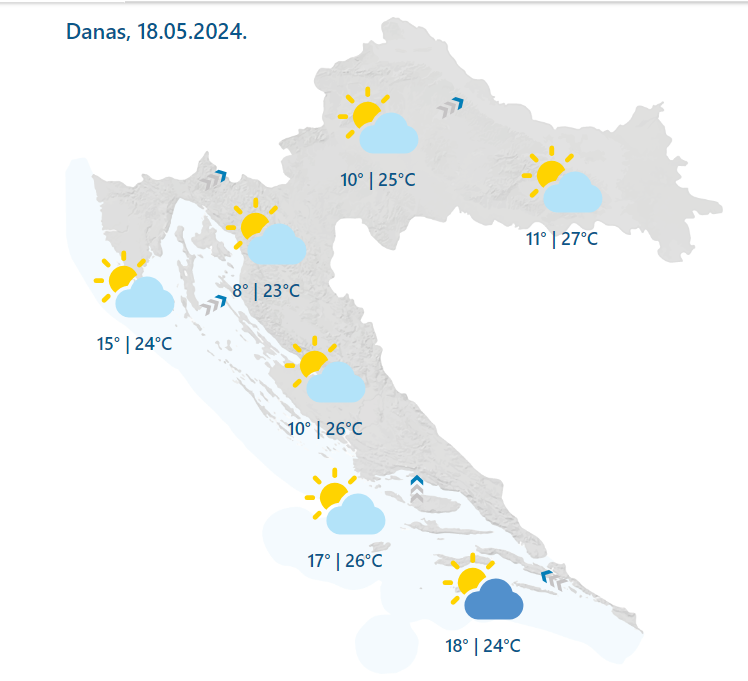 Pretežno sunčano, mjestimice s umjerenom naoblakom čeka nas u većem dijelu zemlje danas. Ujutro ponegdje magla, većinom samo u Podravini i Međimurju, poslijepodne uz prolazno više oblaka, uglavnom na jugu zemlje i u unutrašnjosti Istre lokalno može pasti malo kiše ili pljusak. Vjetar slab do umjeren jugozapadni, na Jadranu i jugo, a ujutro duž obale burin. Najviša dnevna temperatura većinom od 22 do 27 °Celzija.