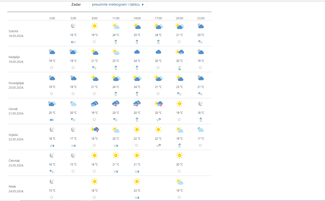 Pretežno, poslijepodne djelomice sunčano, a uz više oblaka uglavnom na jugu prognoza je i lokalno za Dalmaciju i Zadar. Može pasti malo kiše ili pljusak. Slabo do umjereno jugo i jugozapadnjak. Najviša dnevna temperatura između 23 i 26 stupnjeva…