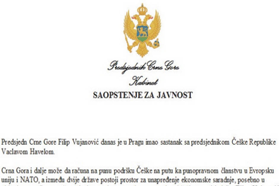 “Predsjednik Crne Gore Filip Vujanović je u Pragu imao sastanak s predsjednikom Češke Republike Vaclavom Havelom”, obavijest je koju su iz Ureda predsjednika dobili crnogorski novinari. Osim činjenice da je Havel bio predsjednik Češke u dva mandata od 1993. do 2003. godine, za Vujanovića je otegotna okolnost da je Havel zapravo preminuo još u prosincu prošle godine!