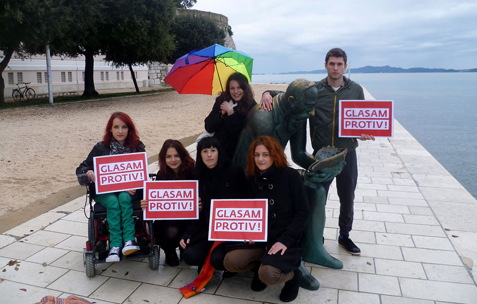 Inicijativa studenata i građana “Glasaj protiv – Zadar” uputila je svoje priopćenje medijima u kojima pozivaju sve građane da, bez obzira na seksualne i emocionalne odabire, bez obzira na vrstu obitelji, 1. prosinca izađu na referendum i na pitanje “Jeste li za to da se u Ustav RH unese odredba po kojoj je brak životna zajednica žene i muškarca?” odgovore – PROTIV!