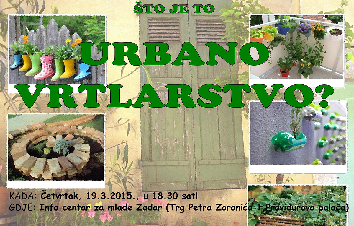 Lokalni Info centar za mlade Zadar u suradnji s udrugom “Eko-Zadar”, udrugom za očuvanje bioraznolikosti “Aurelia” te ostalim suradnicima organizira predavanje uz tribinu “Što je to urbano vrtlarstvo?”. Predavanje se održava u prostorijama Info centra za mlade Zadar (Trg Petra Zoranića 1, Zadar), u četvrtak, 19. ožujka, s početkom u 18:30 sati.