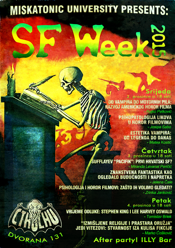 Od 2. do 4. prosinca na Sveučilištu u Zadru održava se SF Week, osmi po redu! Zajednički projekt studenata i profesora Odjela za anglistiku i ove godine donosi pregršt kvalitetnih izlaganja, rasprava na temu SF žanra te zanimljivi program. Kao i svake godine, SF Week vam je pripremio niz kvalitetnih izlaganja od strane profesora i studenata Sveučilišta u Zadru, ali i gostujućih predavača.