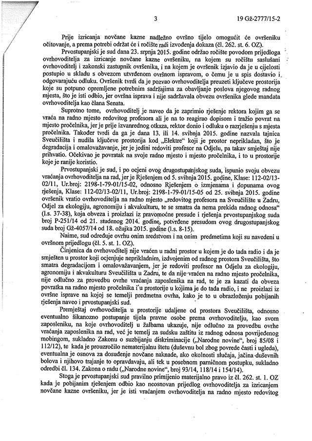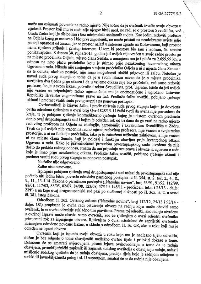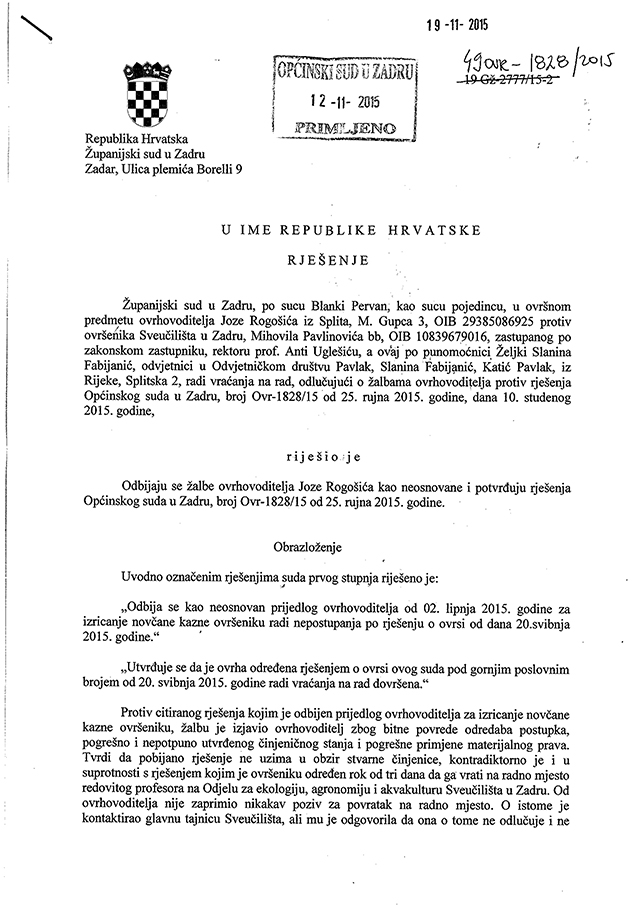 obavješćujemo vas da je Općinski sud u Zadru 25. rujna 2015. donio prvostupanjsku presudu, kojom je potvrđeno da je Sveučilište u Zadru po pravomoćnoj sudskoj presudi prof. dr. sc. Jozu Rogošića vratilo na posao. Prvostupanjsku presudu Općinskog suda potvrdio je drugostupanjskom i pravomoćnom presudom Županijski sud u Zadru 10. studenoga 2015., o čemu je Sveučilište u Zadru službeno obaviješteno 19. studenoga 2015.