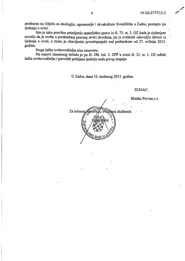 U prilogu Vam dostavljamo pravomoćnu presudu Županijskog suda u Zadru iz koje je
