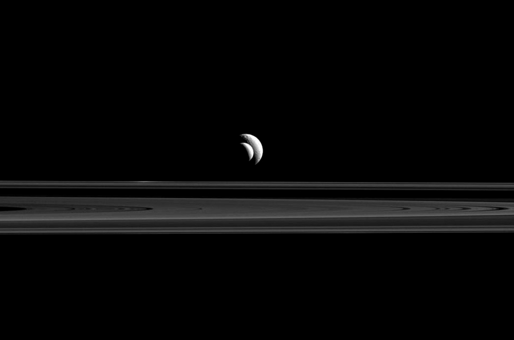 U orbiti oko Saturna se nalazi barem 150 mjeseca i sličnih tijela, od čega ih tek pedesetak ima službeno ime. Dva mjeseca, Enkelad i Tetis, u rujnu su se gotovo savršeno poklopili jedan ispred drugog ‘poziravši’ za NASA-inu letjelicu Cassini.