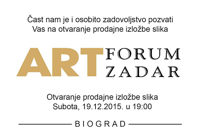 U subotu, 19. prosinca 2015., u 19 sati, u Zavičajnom muzeju u Biogradu na Moru, otvara se prodajna izložba slika likovne udruge ART-FORUM-ZADAR. Izložba ostaje otvorena do 25. siječnja 2016.