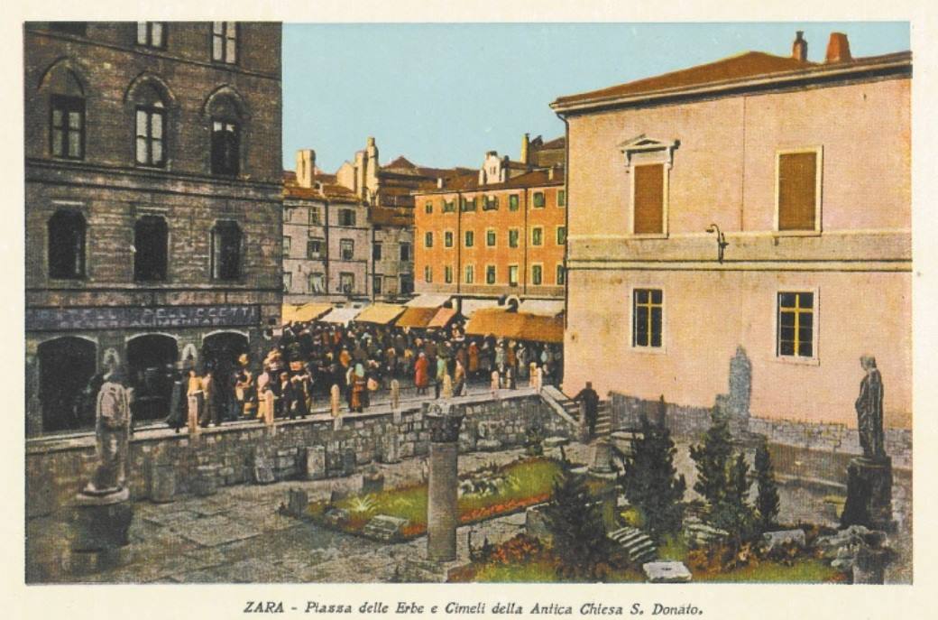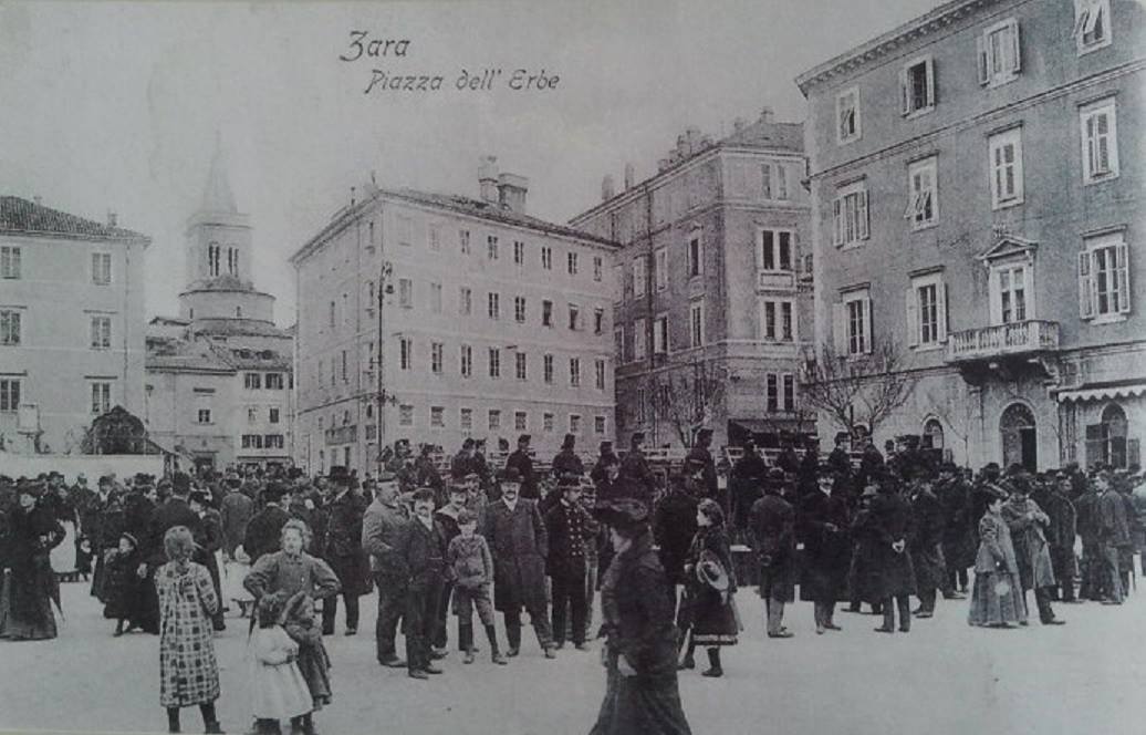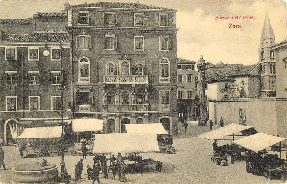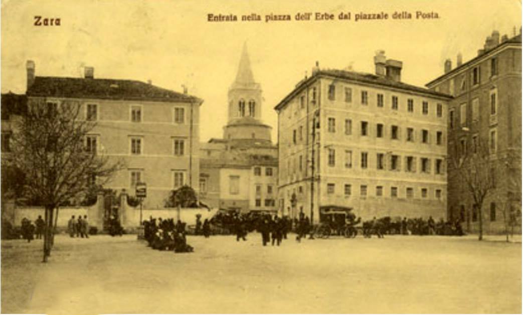 Trg j bio okružen nizom zgrada koje su u prizemljima imale brojne kavane i gostionice. Jedna od poznatijih bila je Cafe dei Dalmati, kao i restoran Dva goluba. Na trgu je bio i prvi zadarski foto atelje u vlasništvu poznatog gradskog ljekarnika Josipa Brčića.