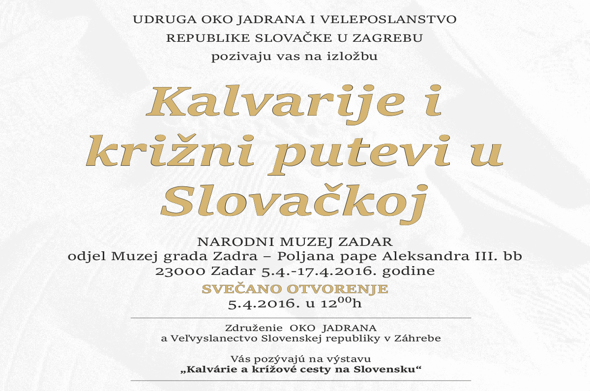 Udruga Oko Jadrana i Veleposlanstvo Republike Slovačke u Zagrebu pozivaju na otvorenje izložbe “Kalvarije i križni putevi u Slovačkoj” u utorak, 5. travnja 2016. u 12 sati u odjelu Muzej grada Zadra NMZ.