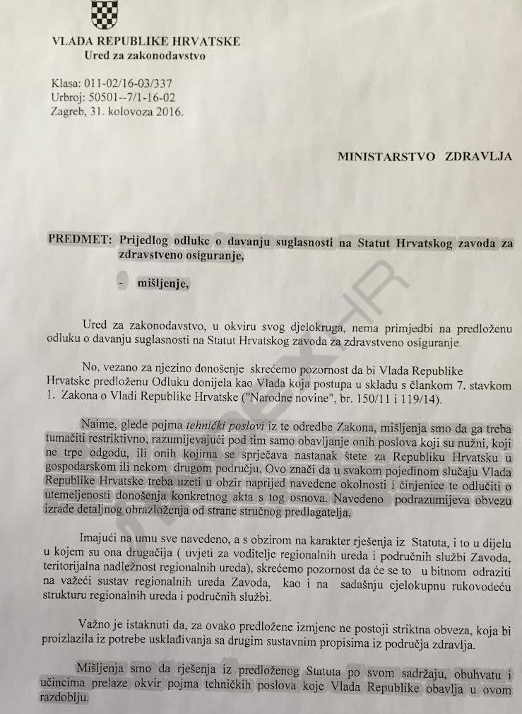 “Mišljenja smo da rješenja iz predloženog Statuta po svom sadržaju, obuhvati i učincima prelaze okvir pojma tehničkih poslova koje Vlada Republike obavlja u ovom razdoblju”, stoji u dokumentu Ureda za zakonodavstvo.