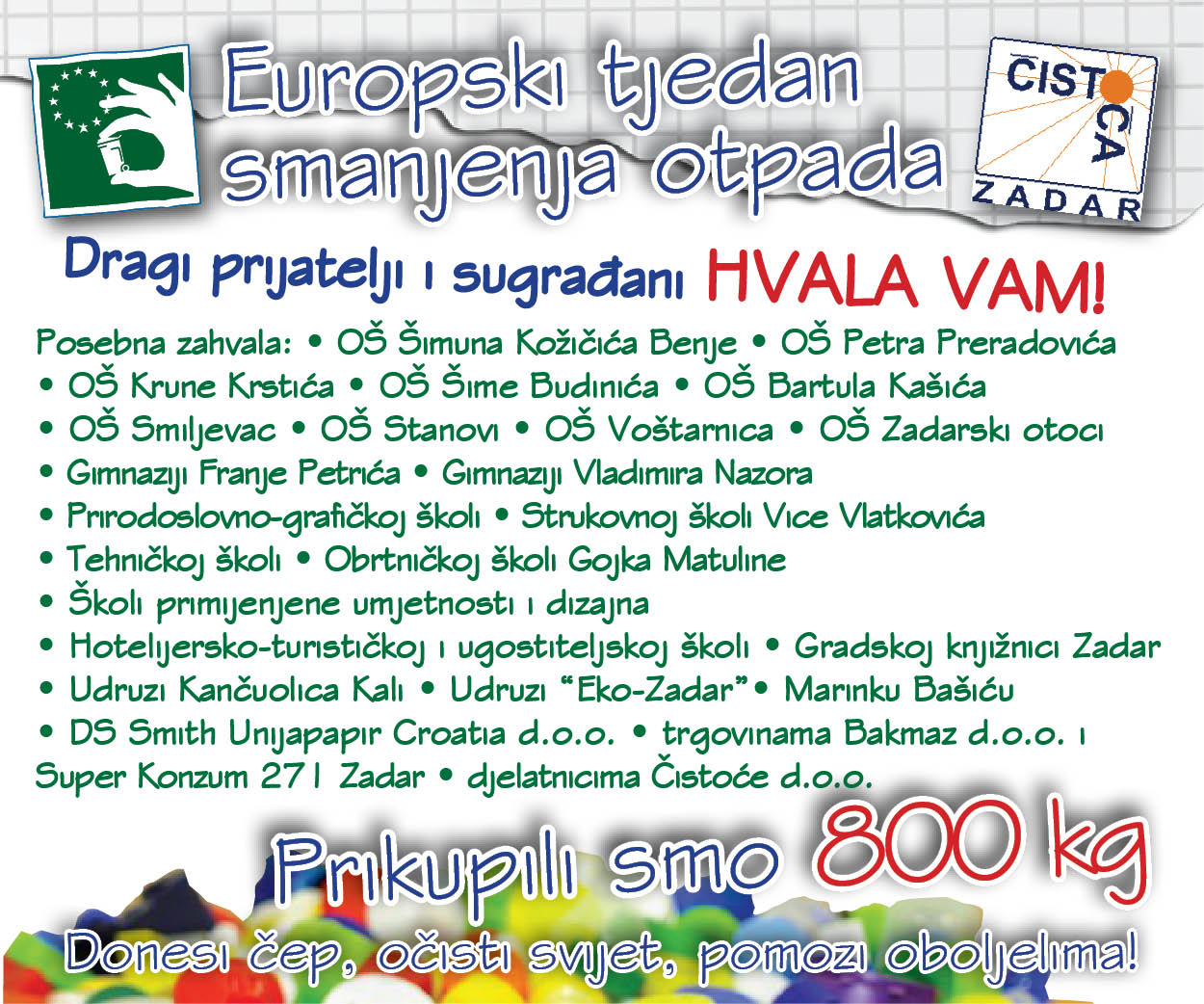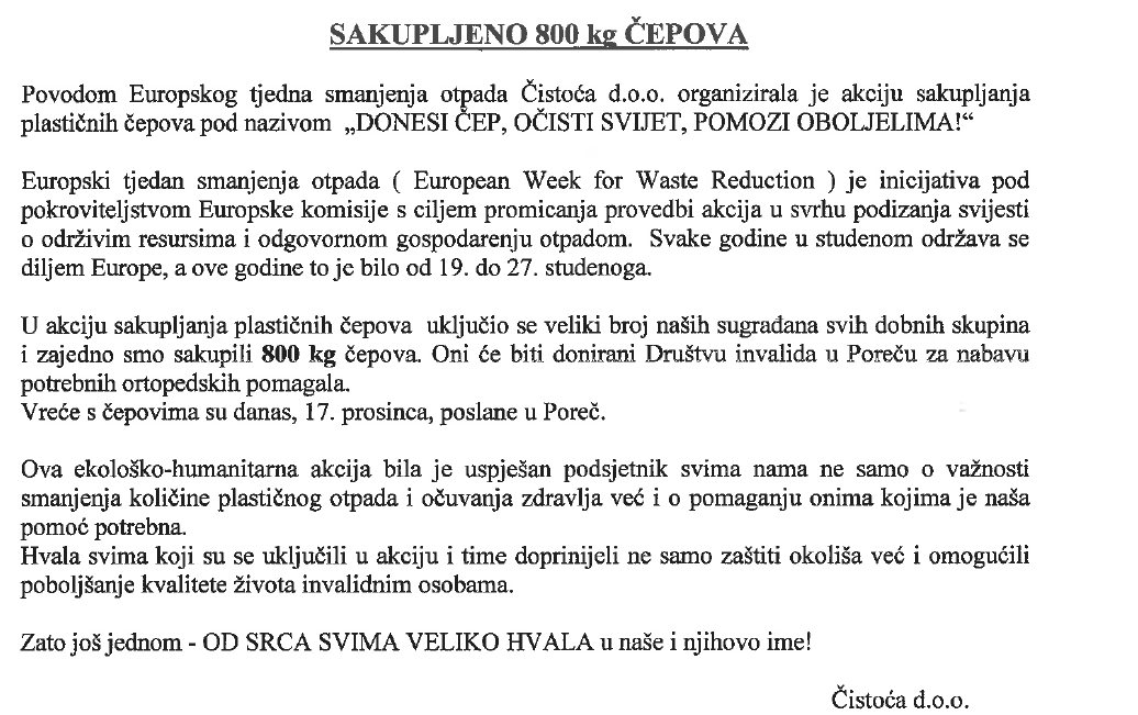 800 kilograma sakupljenih čepova pomoći će oboljelima! Antena Zadar Objavljeno: 19. prosinca 2016. 18:15 čistoćačistoća zadar