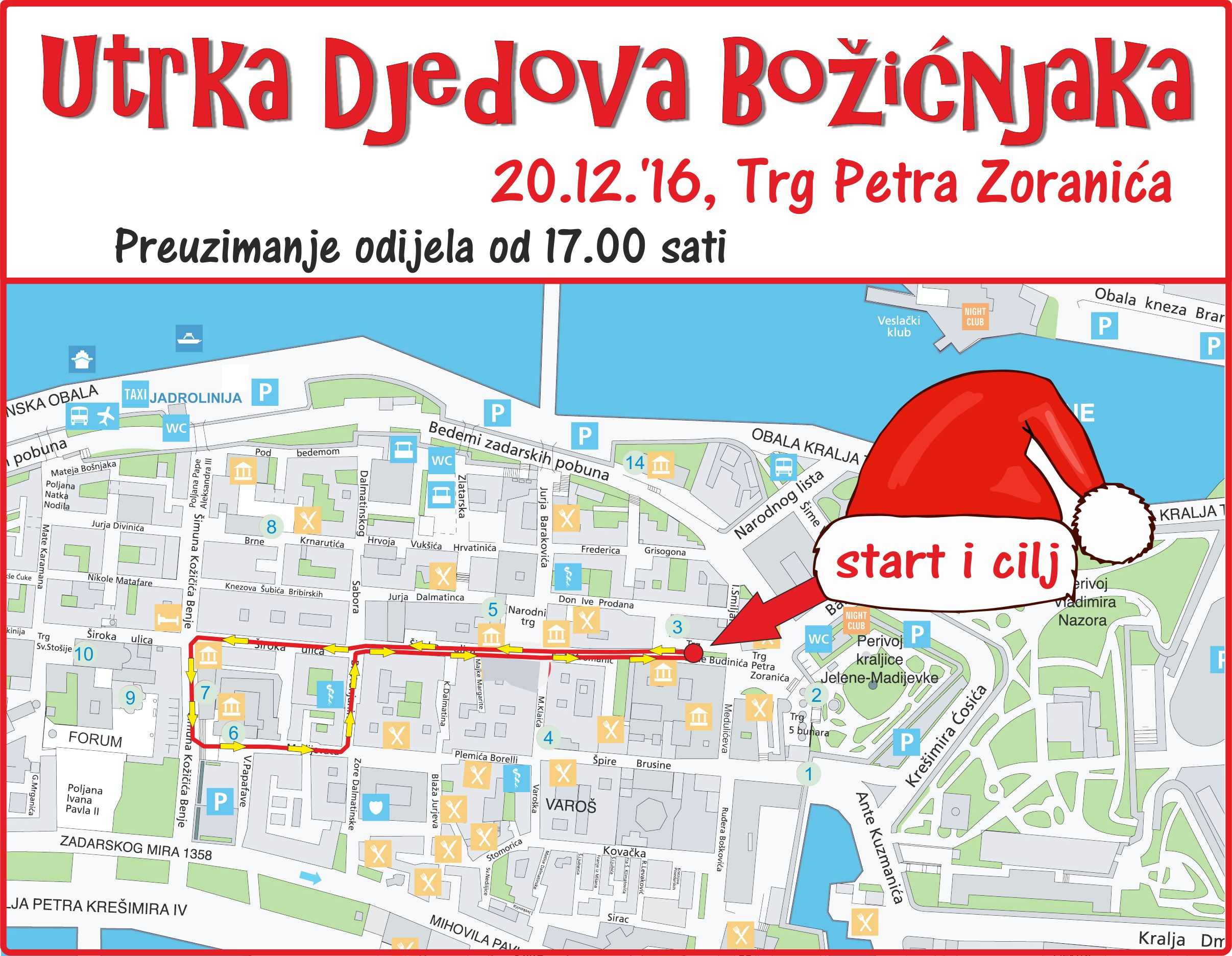 Organizatori „Utrke Djedova Božićnjaka“ pozivaju Zadrane da već od 17 sati mogu doći na Trg Petra Zoranića i preuzimati jednokratna odijela, odnosno zabavljati se uz program „Adventa u Zadru“.