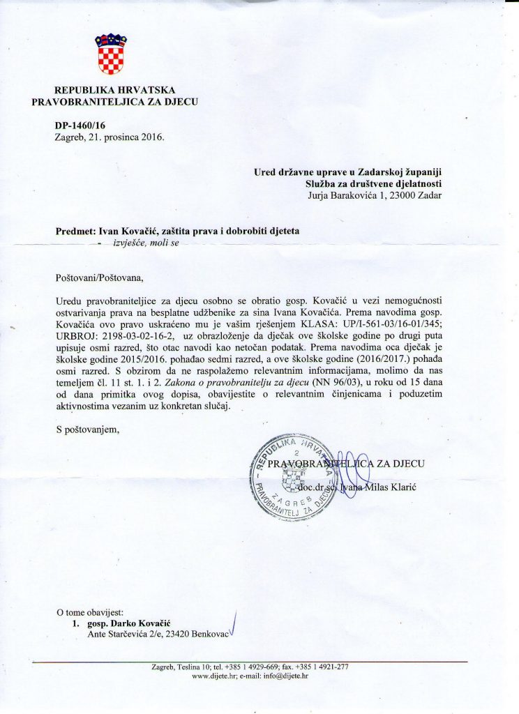 Do dana današnjeg obitelji Kovačić iz Benkovca nitko nam se nije obratio iz ureda državne uprave u Zadarskoj županiji ,službe za društvene djelatnosti koja se nalazi na adresi ;Jurja Barakovića 1 ,23000 Zadar ,o zakinutom pravu za dijete Ivan Kovačić ,,Autizam,, te kako ne bi pravo na besplatne udžbenike bile uskraćene već vraćene kao prethodnih godina što smo imali te ostvarivali gore navedeno pravo po zakonskoj regulativi Republike Hrvatske .