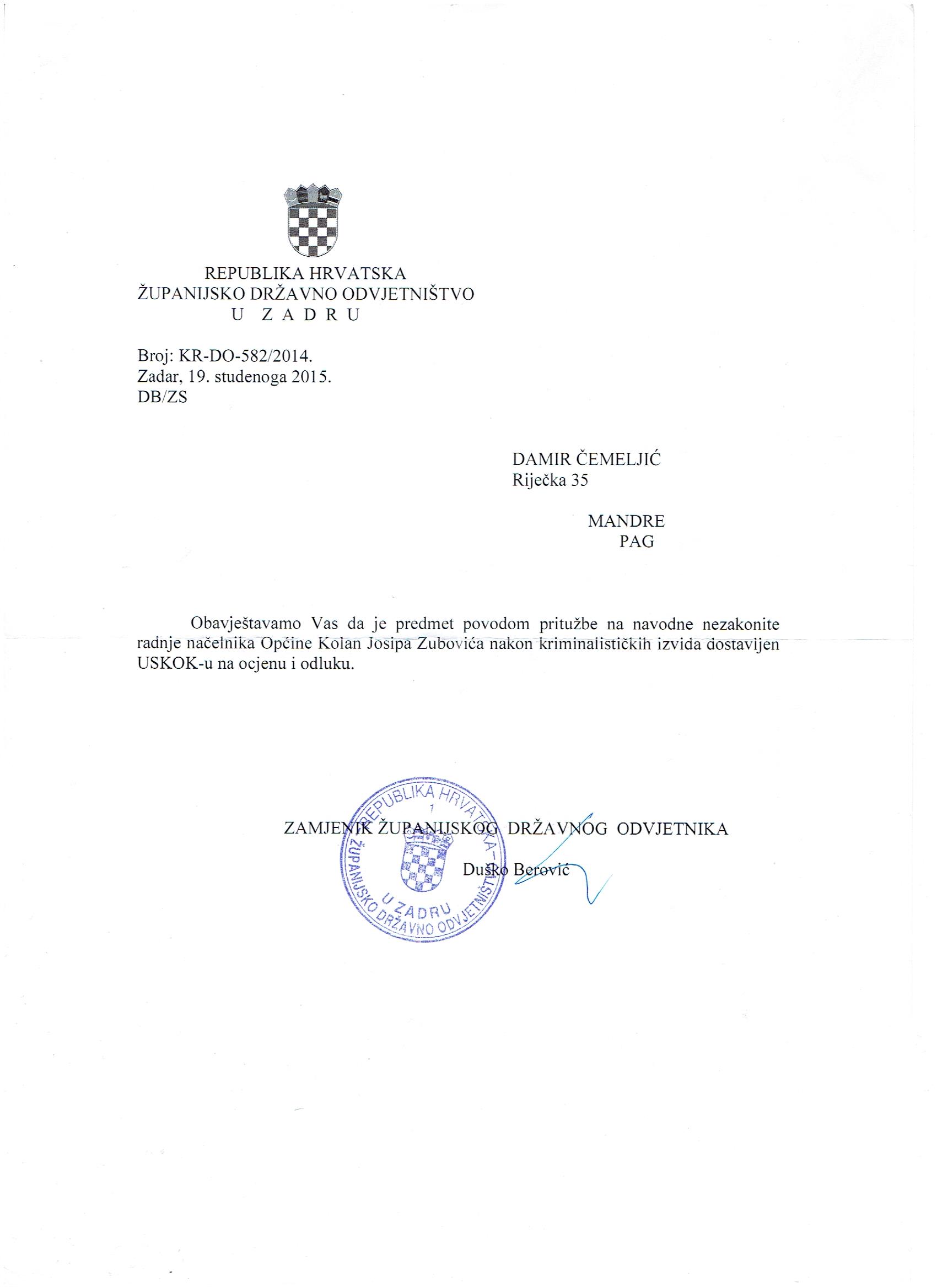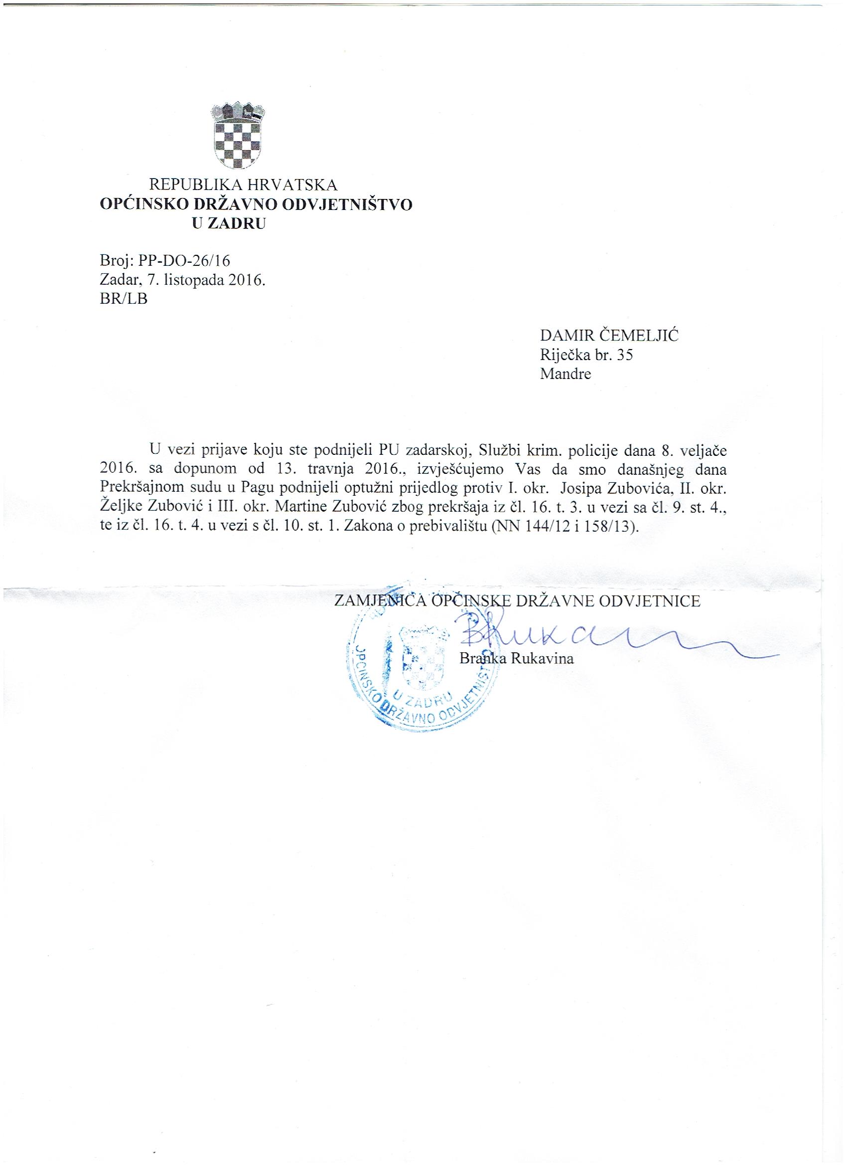 – Zubović je najavio povlačenje iz politike, no navodno će predvoditi HSS u Pagu. Protiv njega se vodi nekoliko postupaka. DORH je utvrdio kako je prijavio lažno prebivalište na adresi Ante Starčevića 3 u Kolanu, a vodi se i postupak protiv njega jer si je šest godina upisivao veću plaću i tako oštetio državu za 100 tisuća kuna, tvrdi Čemeljić i prilaže dokumente.