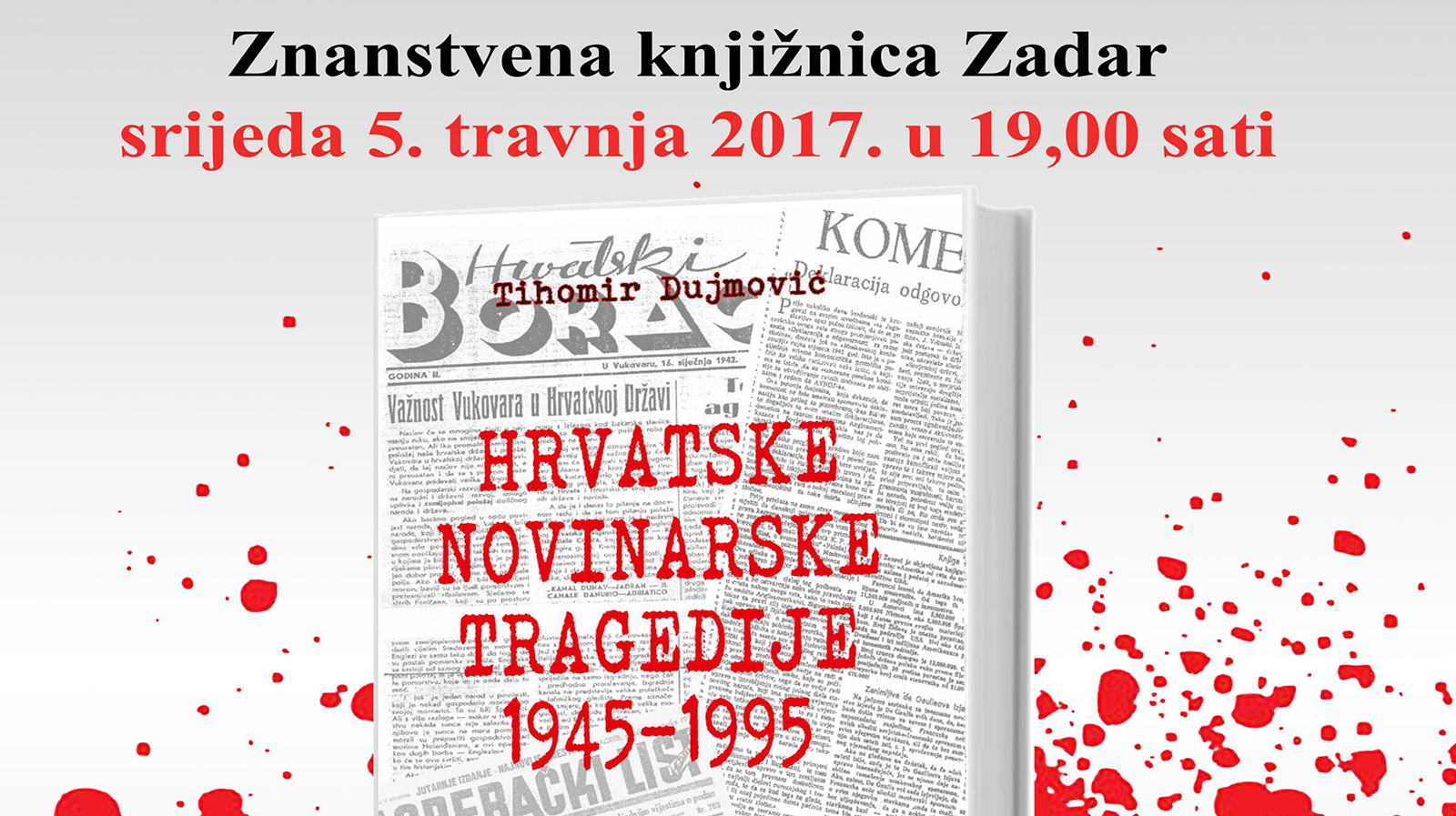 U srijedu, 5. travnja u 19,00 sati u Izložbenoj dvorani Znanstvene knjižnice održat će se predstavljanje knjige “Hrvatske novinarske tragedije 1945-1995” autora Tihomira Dujmovića.