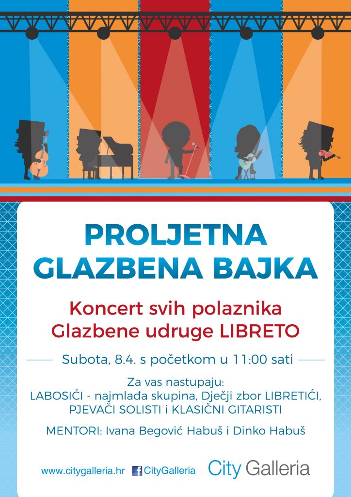 Ovu subotu, 08. travnja sa početkom u 11:00 sati, u centru City Galleria očekuje vas odličan zabavno-glazbeni program za sve posjetitelje. Održat će se koncert svih polaznika Glazbene udruge LIBRETO, a za vas će nastupiti: