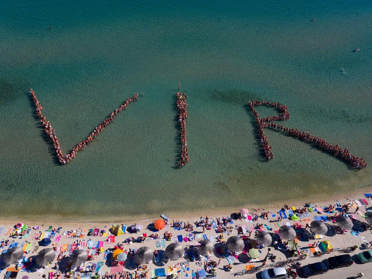 Nemalo je bilo iznenađenje za sve neupućene, pa čak i za one koji Vir redovito posjećuju, vidjeti otok iz zraka na promidžbenom turističkom filmu na prezentacijama u Zagrebu, Rijeci i Osijeku. Vir se doima čudesnim, dosad neotkrivenim kontinentom čije prirodne ljepote – obalne pješčane oaze uronjene u nebeski krajolik i akvamarinsku čistoću mora, spektakularno rumenilo Crvene zemlje ili kamenom ograđene brežuljaste vrhove s kojih se usnuli kolorit velikodušno prostire cijelim pejzažom – oblikuju senzaciju divlje pustoši. Kako izgrađeni dio otoka Vira čini samo 15% od njegove ukupne površine, dojam kontinenta i otočne idile bio je još snažniji. Filmove je, kao i sve prethodne o brojnim virskim manifestacijama, uz pomoć dronova snimio i montirao 45-godišnji virski Karlovčanin Srećko Radelić sa svojim sinovima: 19-godišnjim Jurom i 18-godišnjim Nikolom.