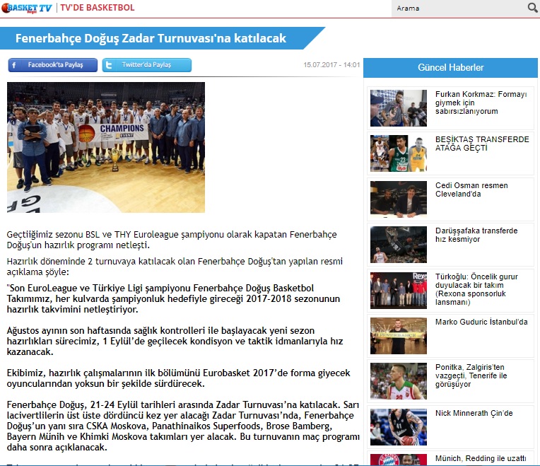 Zadar Basketball Tournament održava se od 21. do 24. rujna u dvorani Krešimir Ćosić na Višnjiku, a na njemu igraju Fenerbahce, Panathinaikos, CSKA Moskva, Khimki, Brose Bamberg i Bayern Munchen. Kao i posljednjih godina i ove su godine, čak ranije nego inače, svoj dolazak na turnir najavili brojni svjetski skauti što je ujedno pokazatelj jačine ovogodišnjeg turnira. Dva finalista Final Foura i čak pet euroligaša izvrsna su reklama za hrvatski sportski turizam koji je tek u začecima.