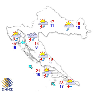 Promjenljivo i pretežno oblačno, povremeno uz kišu, ponegdje i pljuskove s grmljavinom. Najmanje se oborine očekuje na istoku i jugu zemlje. Vjetar većinom slab, na Jadranu slabo i umjereno jugo i istočnjak, a ujutro i navečer duž obale ponegdje bura. Najviša temperatura uglavnom od 15 do 20, u Dalmaciji i do 23 °C.