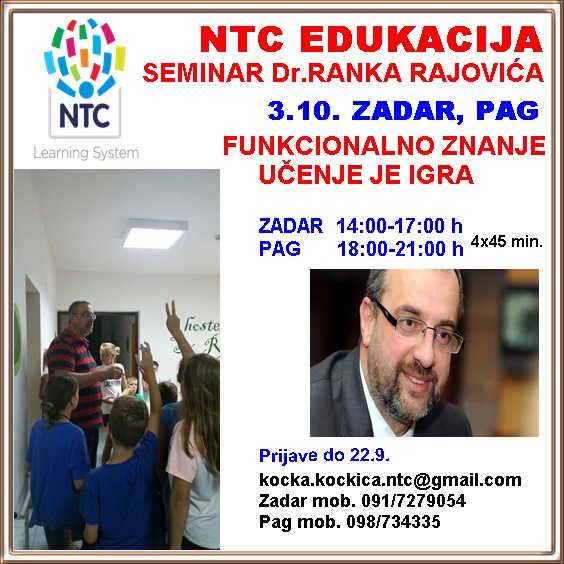 NTC edukacija će se u Zadru održati 3.10. u knjižnici Strukovne škole Vice Vlatković s početkom u 14h i s trajanjem od 4 školska sata, te u Pagu 3.10. u Kneževom Dvoru s početkom u 18h i istim trajanjem od 4 školska sata.