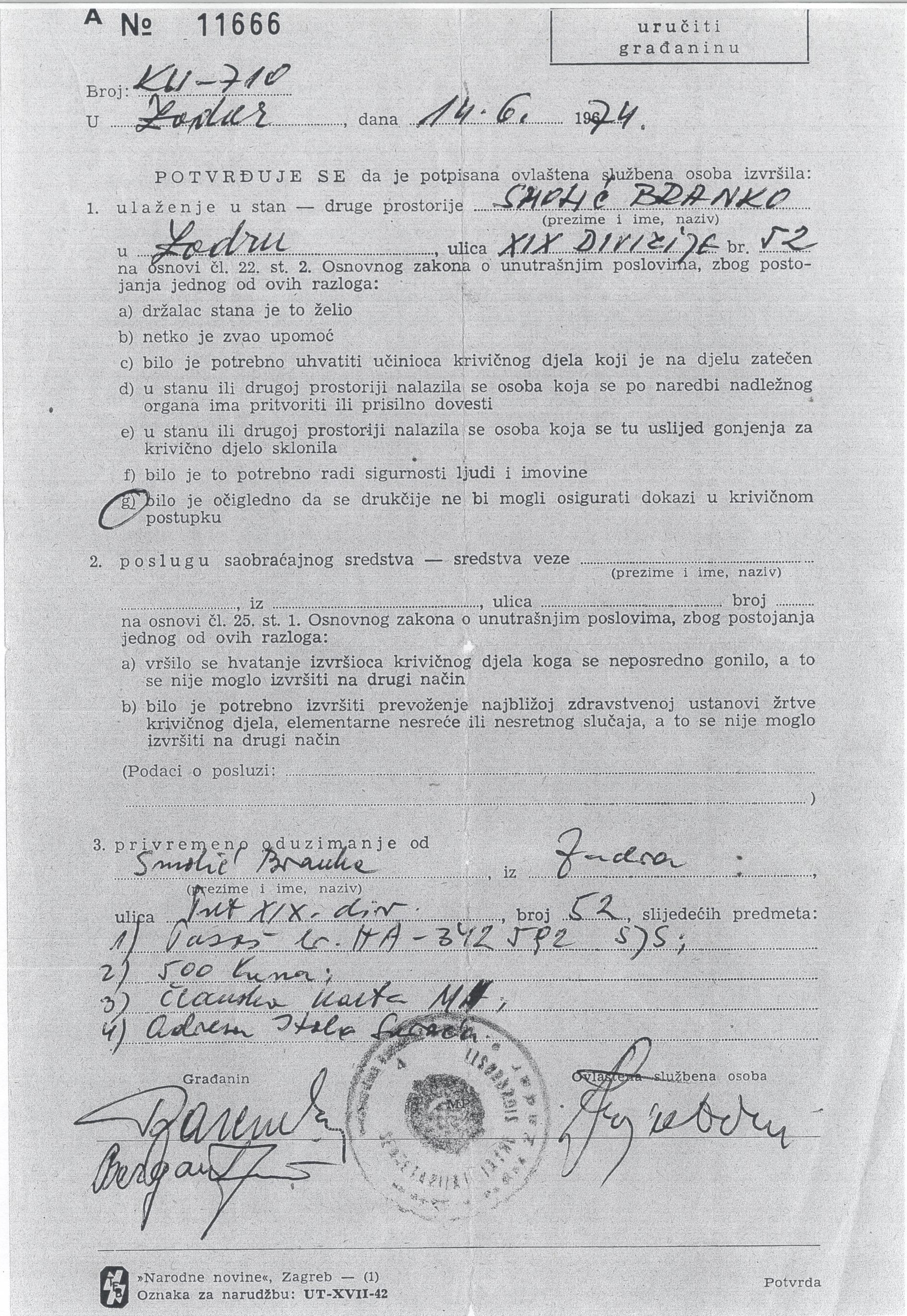 – Dana 14. lipnja 1974. izvršen je pretres stana moje obitelji. Oduzet je pasoš mojega oca Branka, 500 kuna iz bivše države koji su služili kao uspomena na prošla vremena, njegova članska iskaznica Matice hrvatske i adresa jednog Zadranina. Šest dana kasnije izvršen je naknadan pretres stana u kojemu ocu, strastvenom lovcu oduzimaju lovačku pušku i lovački karabin. U postupku koji je dovršen 25. kolovoza sljedeće godine objašnjeno je da su puška i karabin oduzeti jer se zbog ranijeg pretresa sumnjalo da je moj otac potencijalni terorist. I to samo zato što nije skrivao da je bio Hrvat, kazao nam je Dean Smolić.