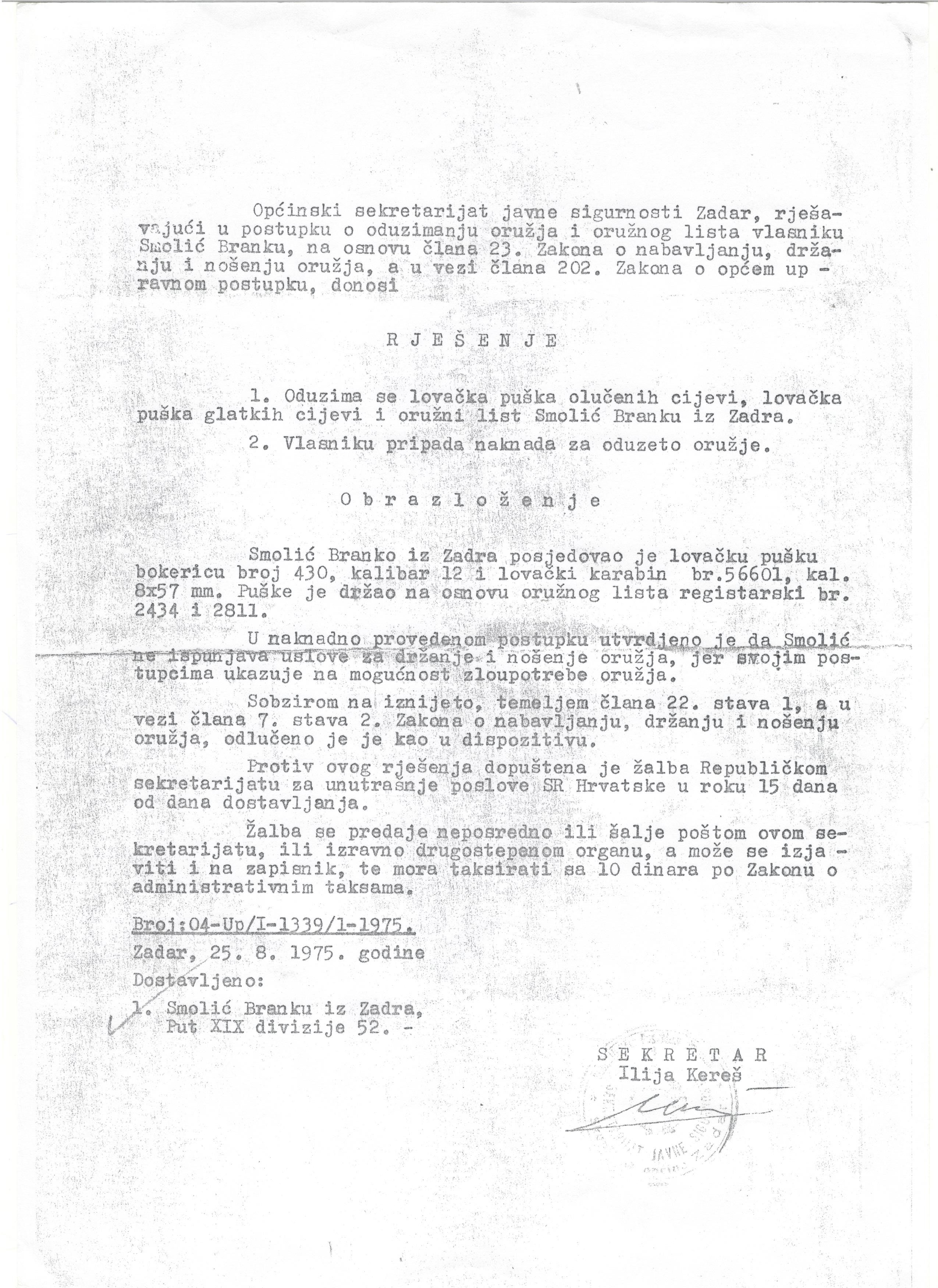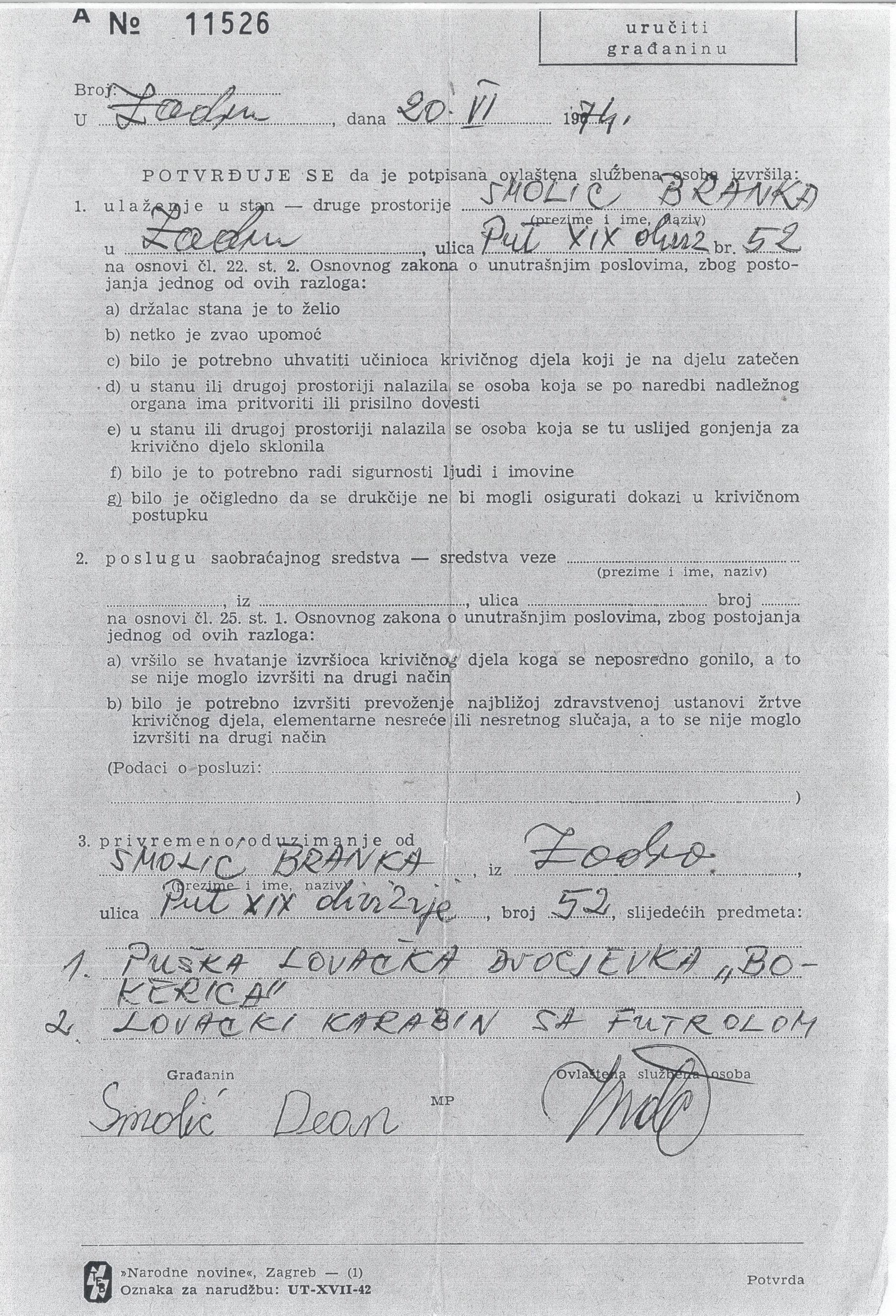 Ono što je dodatno bizarno je činjenica da je dokument o pretresu i oduzimanju lovačkog oružja potpisao sam Dean Smolić, tada devetogodišnjak, kao ‘građanin’ što znači da je ondašnja milicija vrlo lako i bez posljedica mogla ‘plesati’ na granici legalnosti.