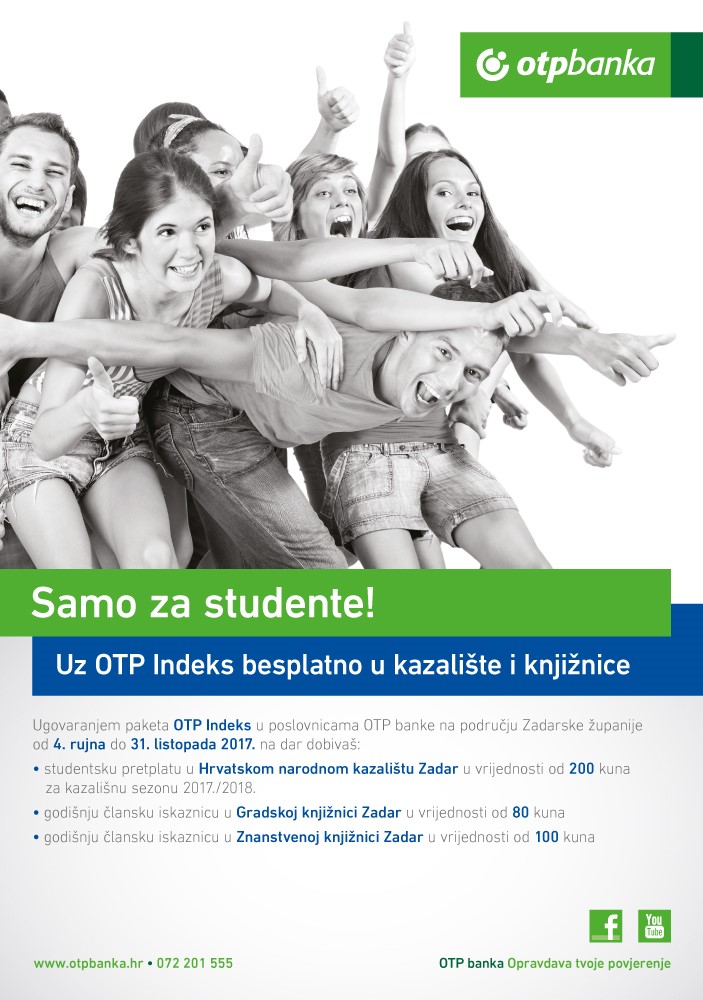 Akcija je započela 4. rujna u trajanju do 31. listopada 2017. Studenti koji ugovore paket OTP Indeks u poslovnicama banke u Zadru, Biogradu, Benkovcu, Ninu, Obrovcu i Preku na poklon dobivaju studentsku pretplatu Hrvatskog narodnog kazališta Zadar u vrijednosti od 200 kuna te članske iskaznice Gradske knjižnice Zadar i Znanstvene knjižnice Zadar.