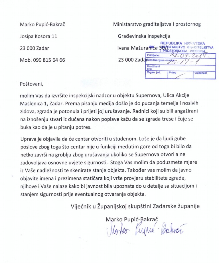 Iako prema zadnjem očitovanju iz centra, Supernova počinje s radom u studenom, jer, kako naglašavaju, nije poremečena statika i šteta je manja negoli se u javnosti pričalo, vijećnik Županijske skupštine Marko Pupić Bakrač pozvao je građevinsku inspekciju da ispita stanje i javnosti podastre podatke o istom.