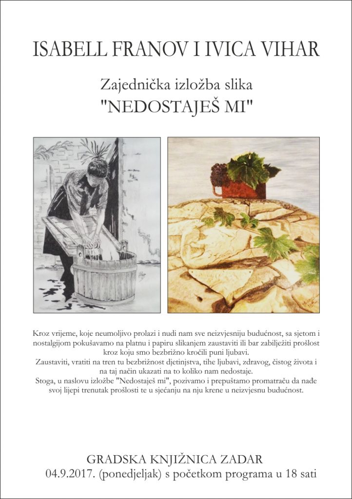 U Gradskoj knjižnici Zadar 4.09-2017 (ponedjeljak) s početkom u 18 sati održat će se otvorenje zajedničke izložbe slika pod nazivom “Nedostaješ mi” autorice Isabell Franov iz Kali i Ivice Vihara iz Kukljice.
