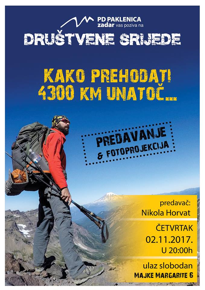 Nikola Horvat u prostore PD Paklenice dolazi pričati o svojoj američkoj avanturi i 163 dana hodanja