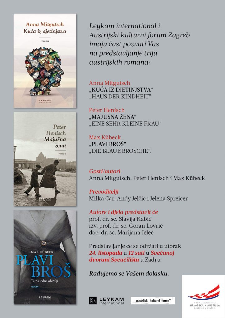 Odjel za germanistiku Sveučilišta u Zadru u suradnji s izdavačkom kućom Leykam i Austrijskim kulturnim forumom iz Zagreba organizira predstavljanje prijevoda knjiga poznatih austrijskih autora u utorak, 24. listopada 2017. u 12 sati u Svečanoj dvorani Sveučilišta u Zadru.