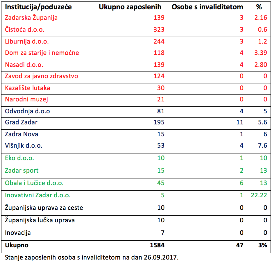 Nakon dugogodišnjih obmana vladajućih kako su za njih osobe s invaliditetom bitan segment društva, odlučili smo ispitati kakva je situacija sa zapošljavanjem osoba s invaliditetom u Zadarskoj Županiji, Gradu Zadru i svim poduzećima čiji su oni osnivatelji. Sve ukupno njih 24! Rezultati su poražavajući, a prvi na Tablici srama su upravo institucije i poduzeća koja imaju najviše zaposlenika a samim time i najviše prostora za osigurati osobi s invaliditetom dostojanstven život.