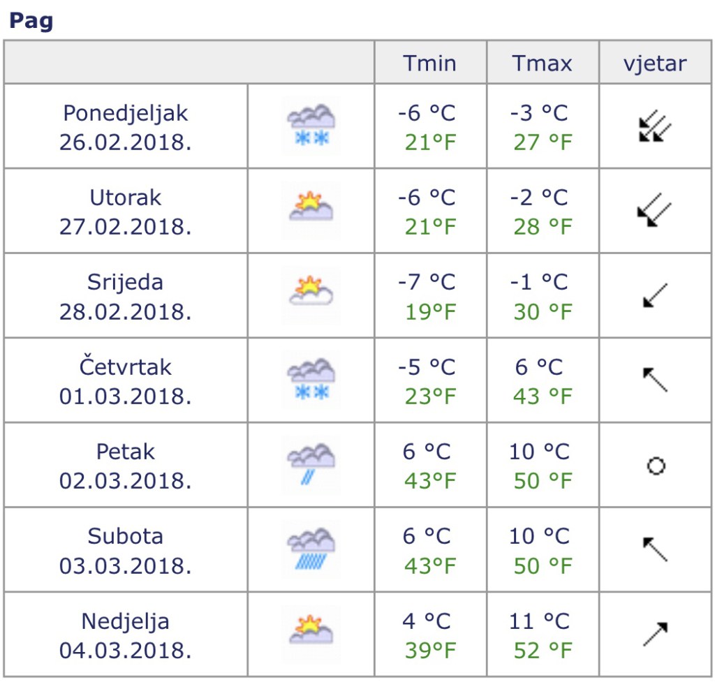 Prema prognozama DHMZ-a temperature bi na otoku baš u srijedu trebale doseći svoje negativne maksimalce te bi se temperature trebale kretati od -7 do -1 Celzijev stupanj.