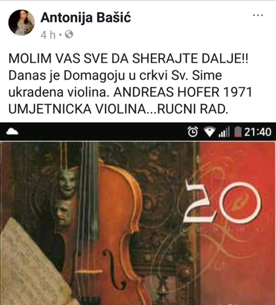 Antonija piše da se radi o violini Andreas Hofner koja je ručni rad i vrlo je vrijedna. Instrument datira iz 1971. godine, a ukraden je u crkvi. Glazbenik se još nada da će se javiti netko s informacijom o ukradenoj violini, pišu 24sata.