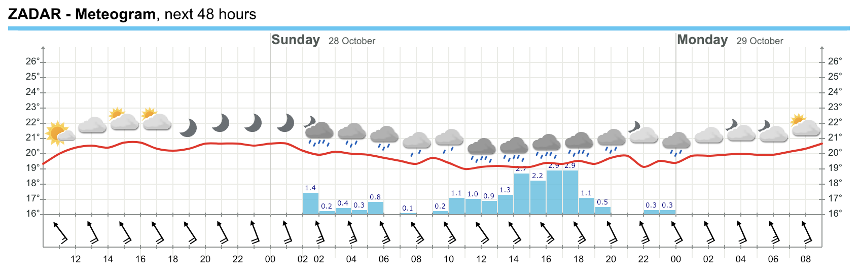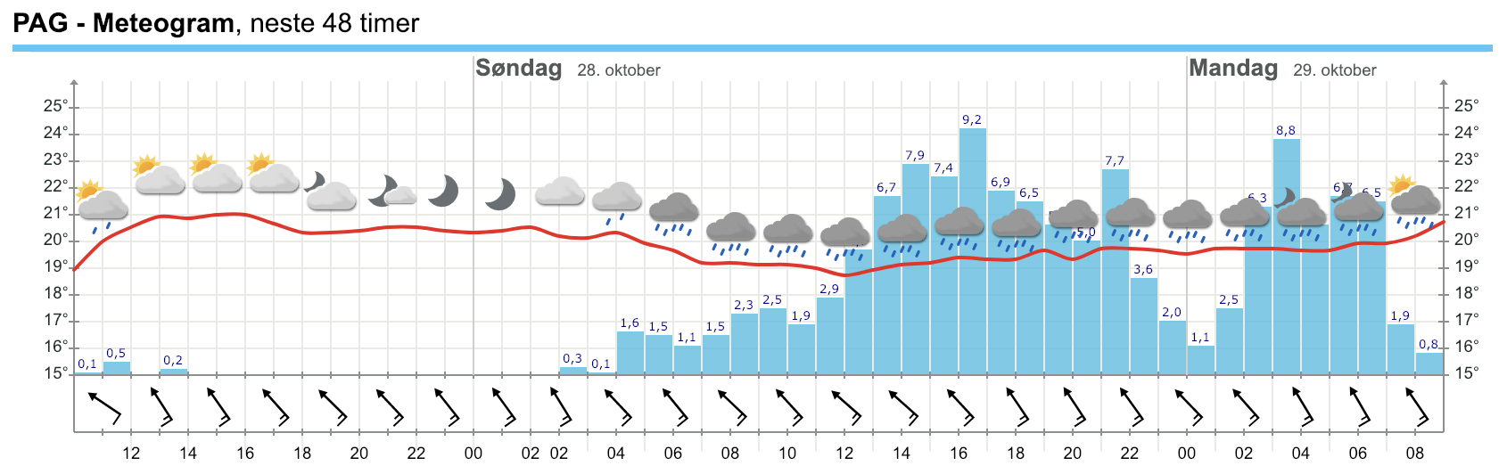 Kiša, ponegdje blatna, bit će češća i obilnija na Jadranu i u gorskim predjelima. Obilnija oborina je na širem riječkom području moguća već danas i u subotu, ali u nedjelju, ponedjeljak i utorak velike količine kiše bit će duž većeg dijela Jadrana, u gorskom području te unutrašnjosti Dalmacije. Tih dana u 24 sata može lokalno pasti i više od 70 litara kiše po četvornom metru, no važno je naglasiti da u razdoblju od nedjelje do utorka ukupna količina oborine ponegdje može biti veća od srednje mjesečne. Dakle, na pojedinim lokalitetima može pasti i više od 200 litara po četvornom metru. Povremene će kiše biti i u sjevernim kopnenim krajevima, no ne tako obilne kao na Jadranu i u gorju.