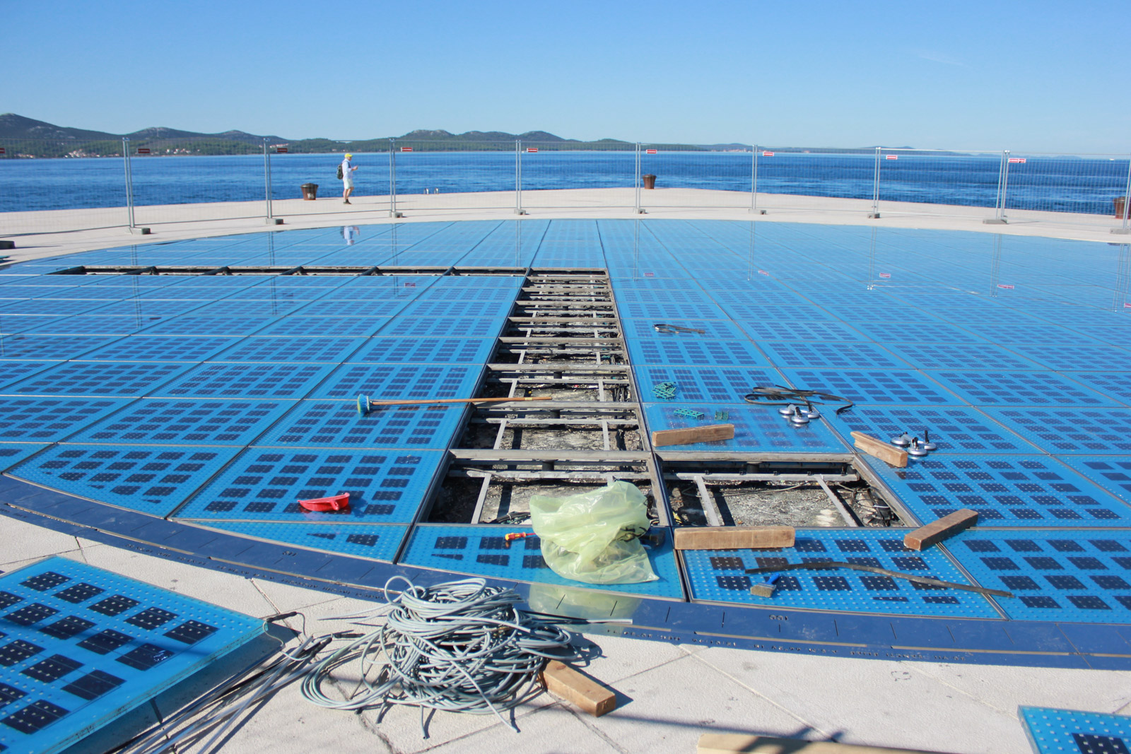 – Mijenjamo ploče, njih šest koje imamo na lageru, od sedam ujutro smo na terenu. Ovo ostalo odradit će tvrtka koncesionar Marex Elektrostroj. Jučer smo ga ugasili predostrožnosti radi, da ne bi slučajno došlo do kakvog kratkog spoja uslijed oštećenja, no vvečeras će Pozdrav suncu zasvijetliti. Hoće li se po njemu moći gaziti, odlučit će se tijekom dana.