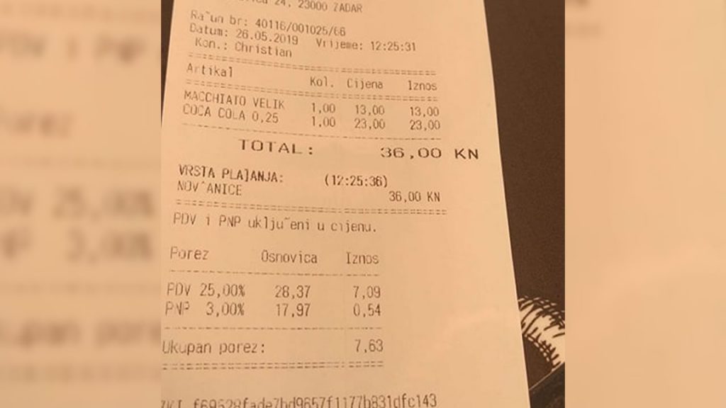 S dolaskom ljeta, tako, osim fotografija uživancija s plaže, na društvenim mrežama počinju se vrtjeti slike računa kave iz centra. Naišli smo na jednu iz srca Zadra.