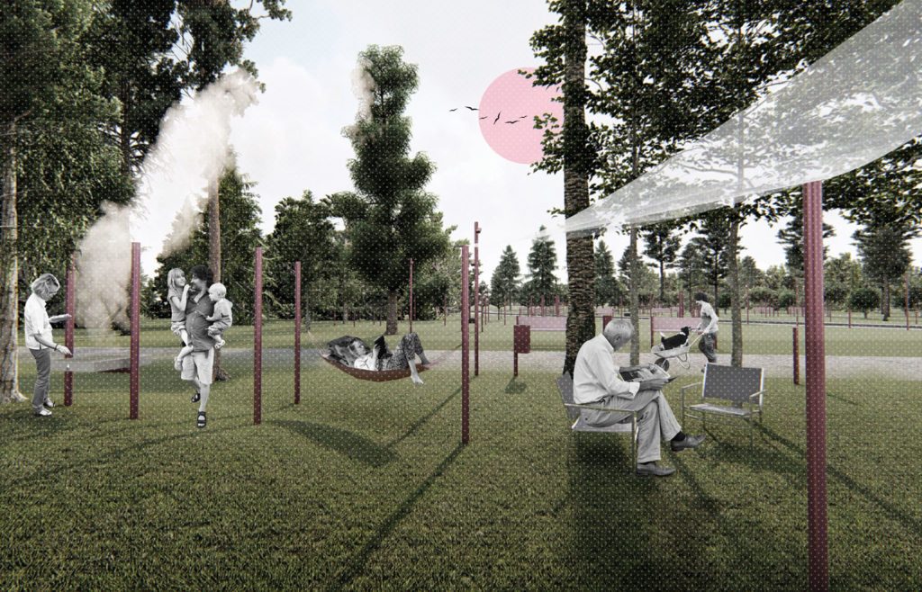 Projekt prvenstveno negira bilo kakva nametnuta kretanja kroz park. Njegov parter se tretira uvijek isto, kao jednolika tekstura pod borovom šumom. Ukidanjem dosad poznatog ponašanja stanovnicima se omogućava istraživanje, stvaranje novih smjerova i prisvajanje krajolika. Glavna premisa podrazumijeva uvođenje svjetla kroz zanemarenu zelenu zonu. S ciljem oplemenjivanja parka preuzima se vertikala, njegov suptilni simbol, koja dobiva niz novih značenja. Od nje se formira jednostavan, low budget modul čijim se multipliciranjem na raznovrsne načine intervenira u prostor.