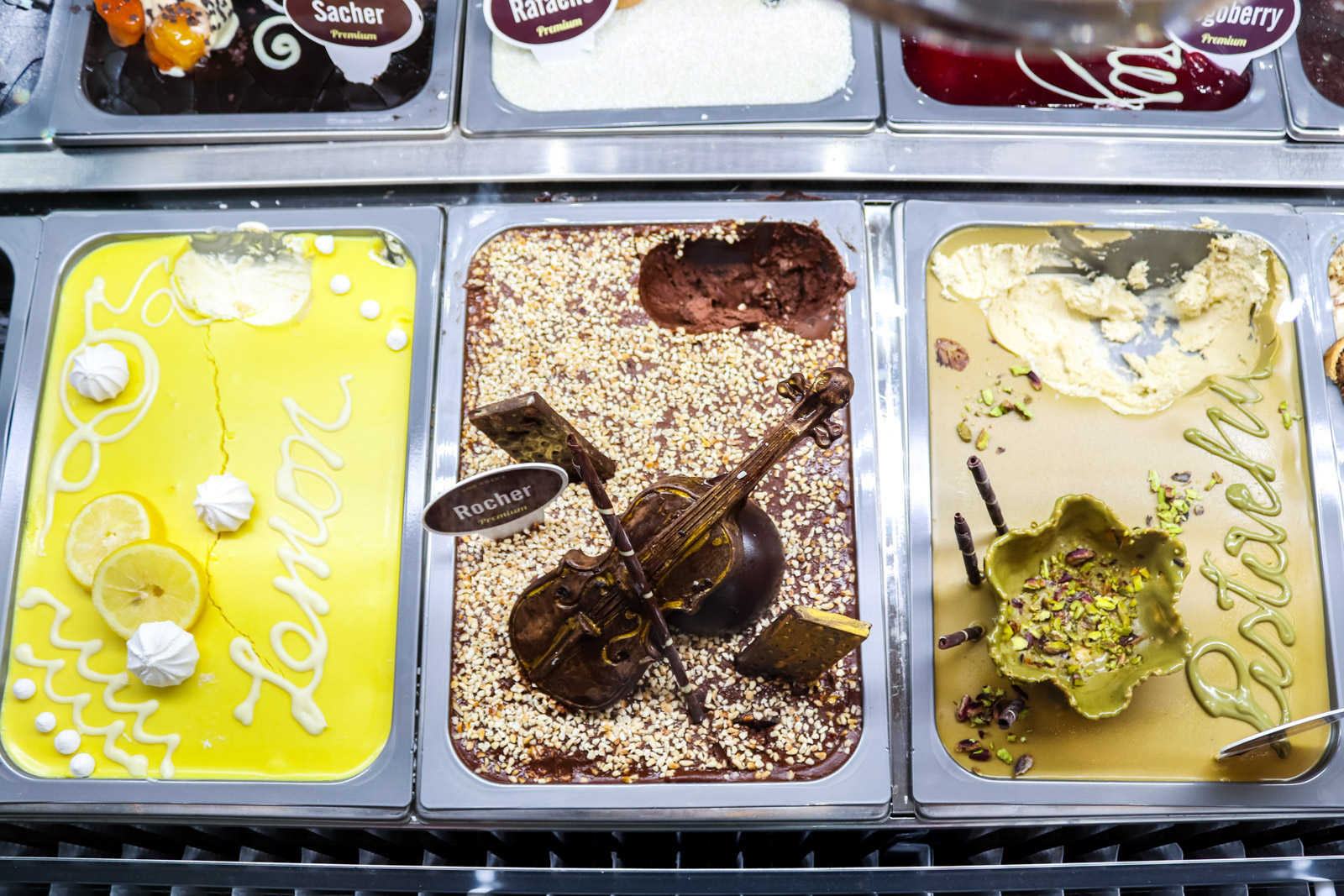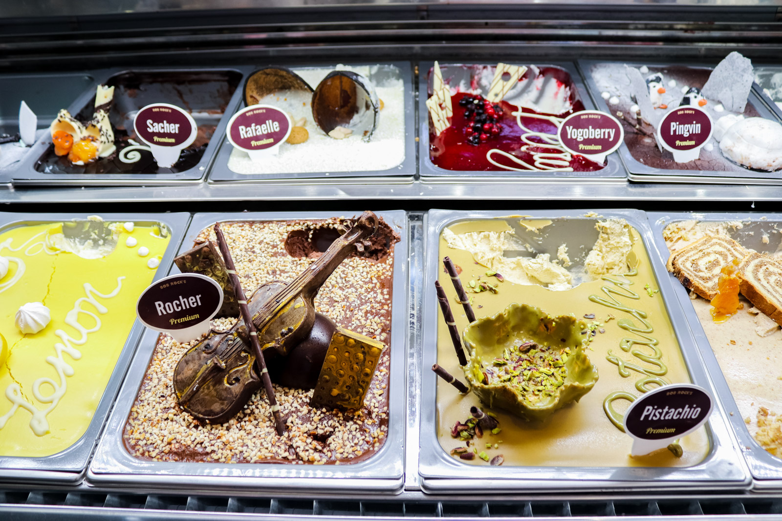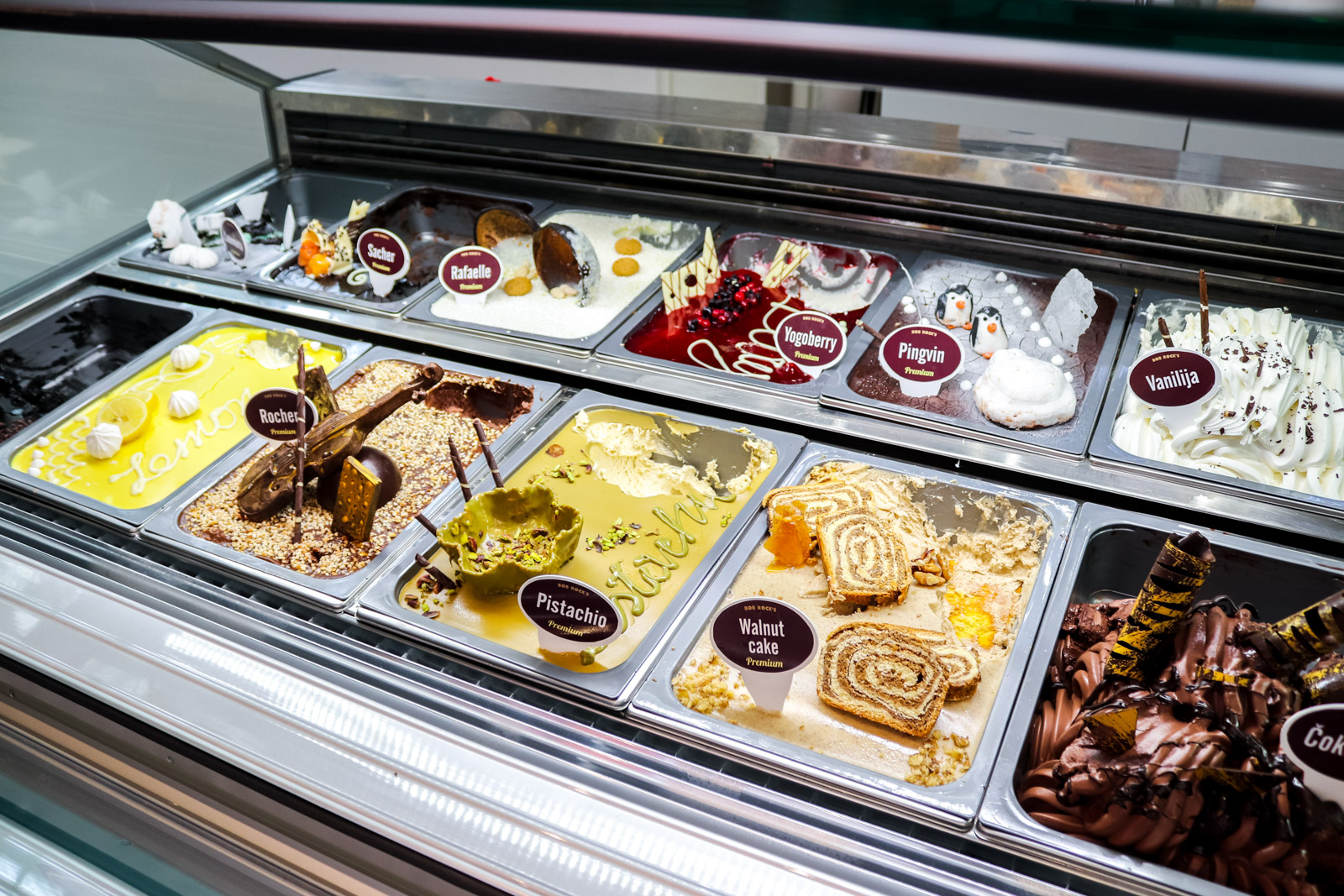 Trend premium okusa u svijetu raste te i ovdje postaju sve popularniji okusi Rocker, Pistachio, Tofee lješnjak, Čokomenta te Lemon pie. Tako detaljno dekorirani sladoledi su nas mamili na degustiranje, mene su posebno oduševili Pistachio i Rafaelle, a kolegu Toffe lješnjak i Yogoberry.
