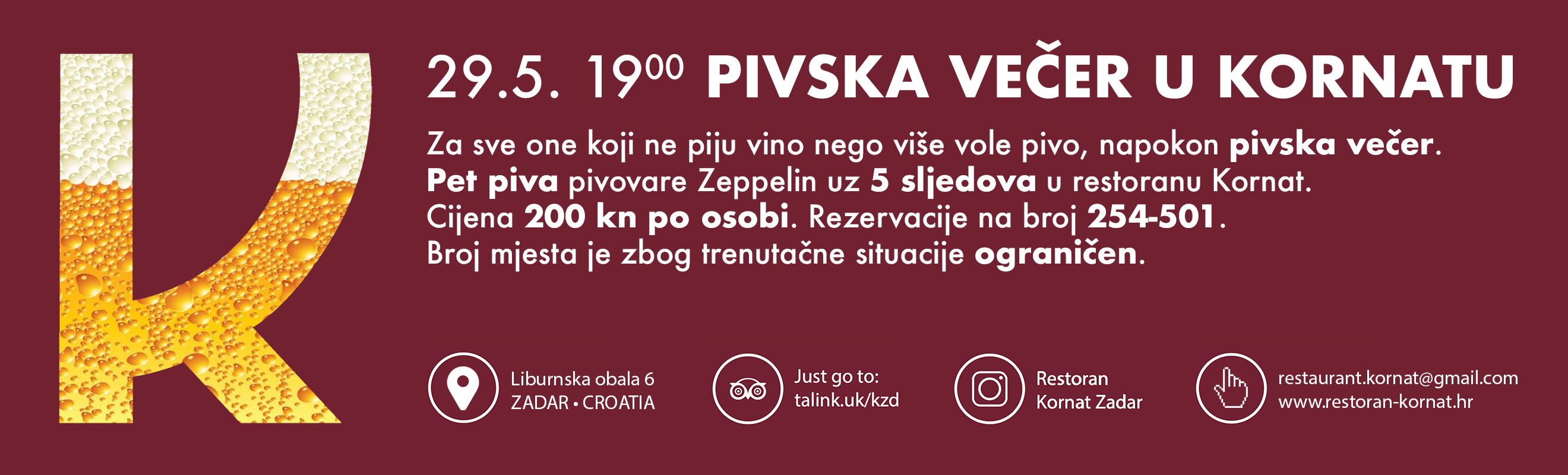 Ljubitelji piva ovog petka, 29. svibnja, doći će na svoje u restoranu Kornat, gdje je po prvi put, nakon brojnih vinskih, organizirana – pivska večer.