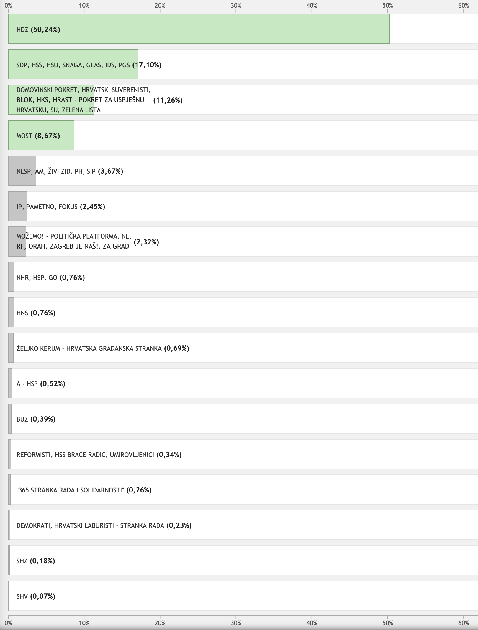HDZ osvaja tako 50,25% glasova, Restart koalicija 17,10%, Domovinski pokret 11,26%, Most nezavisnih lista 8,67%.