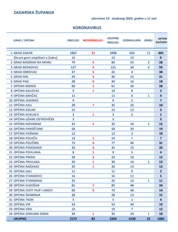 Zadarska županija trenutno broji 1002 aktivna slučaja i više nema ni jedne općine ni grada koji nemaju barem jedan slučaj zaraze.