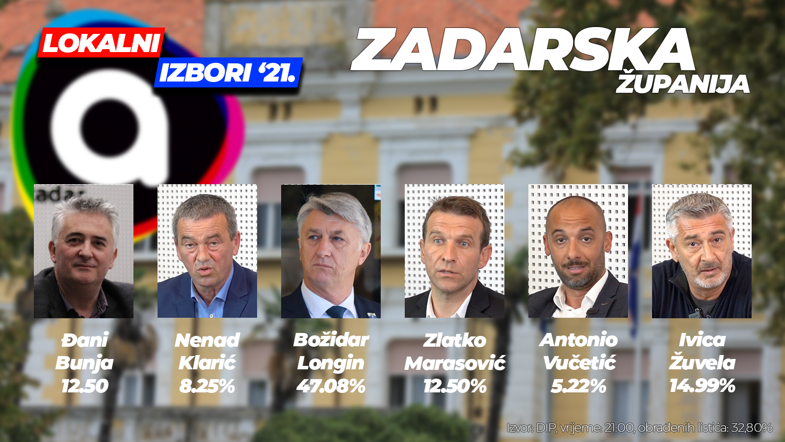 Zlatko Marasović iz koalicije “Srcem za Zadar” osvojio je 20, 48 posto, Antonio Vučetić iz koalicije DSU, HNS, HSLS 6,76, MOST-ov Đani Bunja 6,04, a Nenad Klarić iz Domovinskog pokreta 5,13 posto glasova.