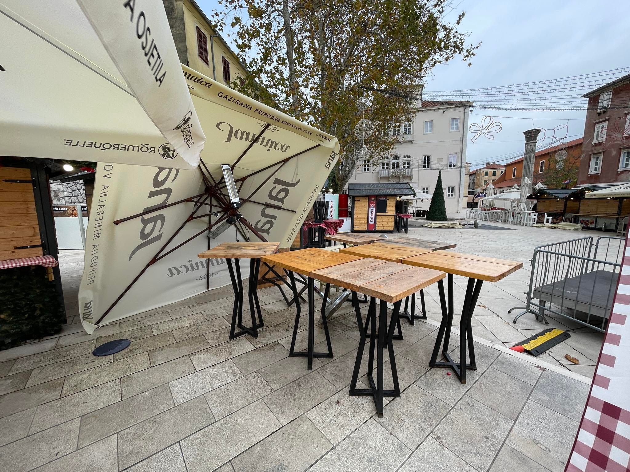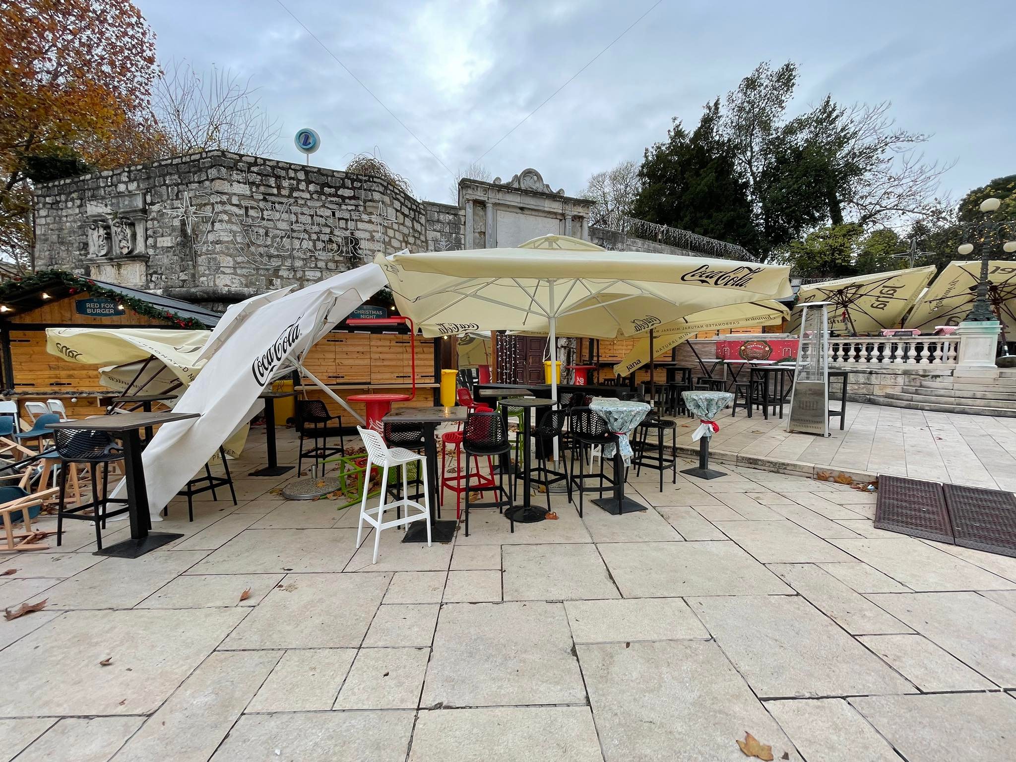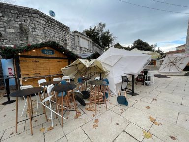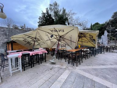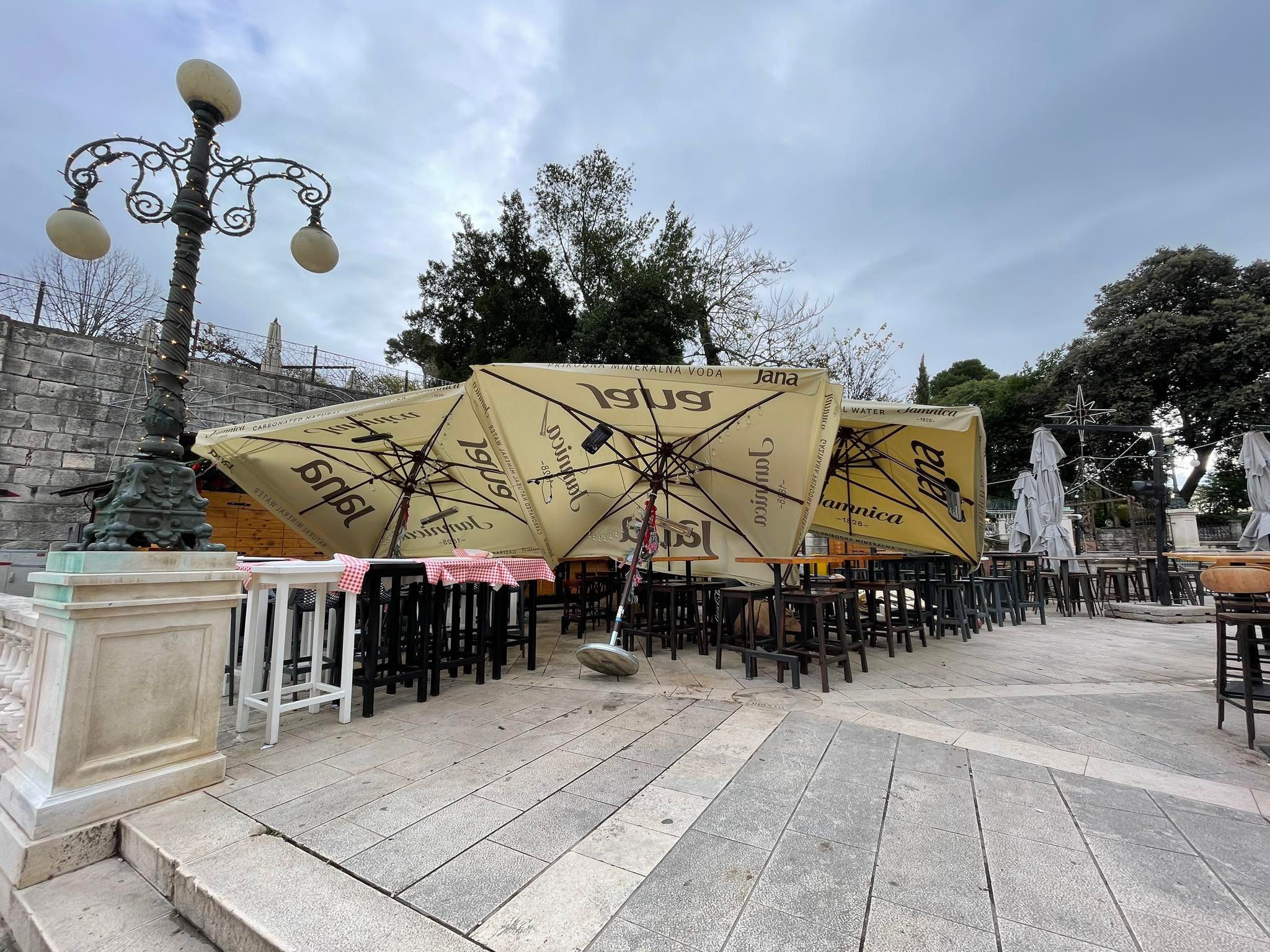 Ugostitelji baš nemaju sreće; Jak vjetar pobacao suncobrane, stolice i stolove na Adventu