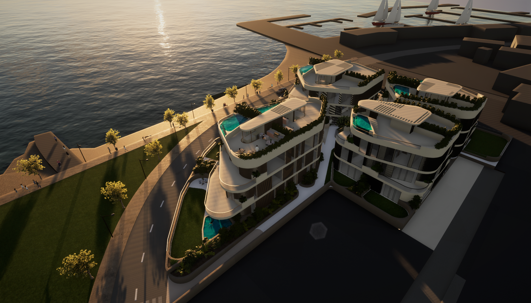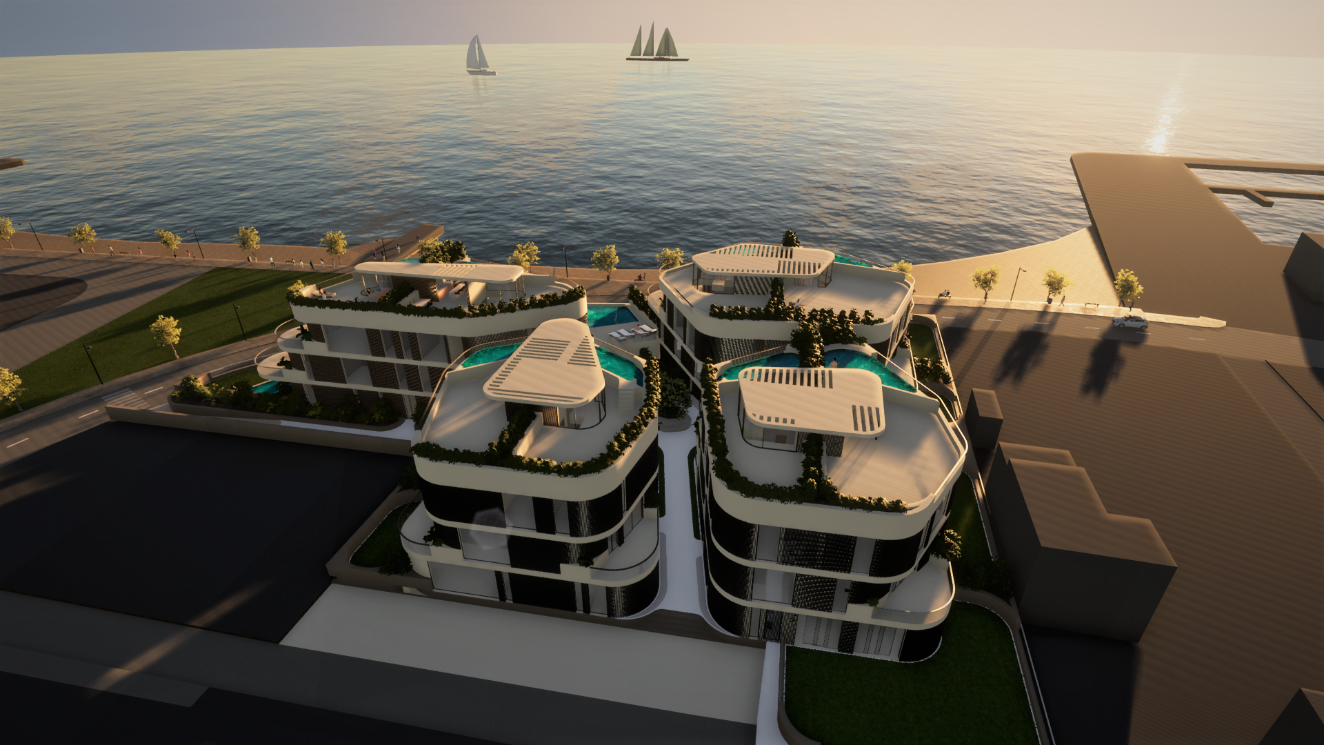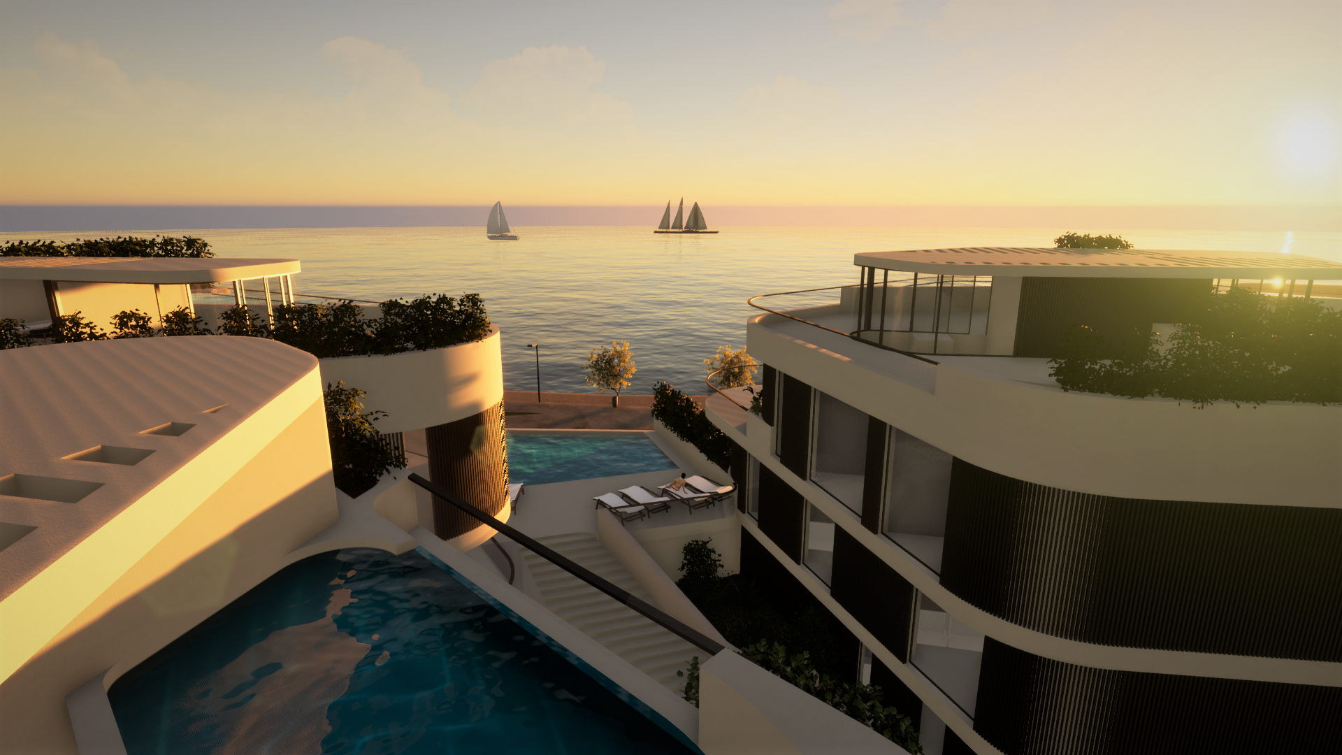 Stanovi u prizemlju imat će terasu ili loggiu te dvorište, a neki i bazen ili jacuzzi. Stanovi na prvome katu imat će velike terase te će imati pristup zajedničkom bazenu na platou. Po želji klijenta, mogući su i dodatni bazeni ili jacuzziji u stanovima na prvome katu.