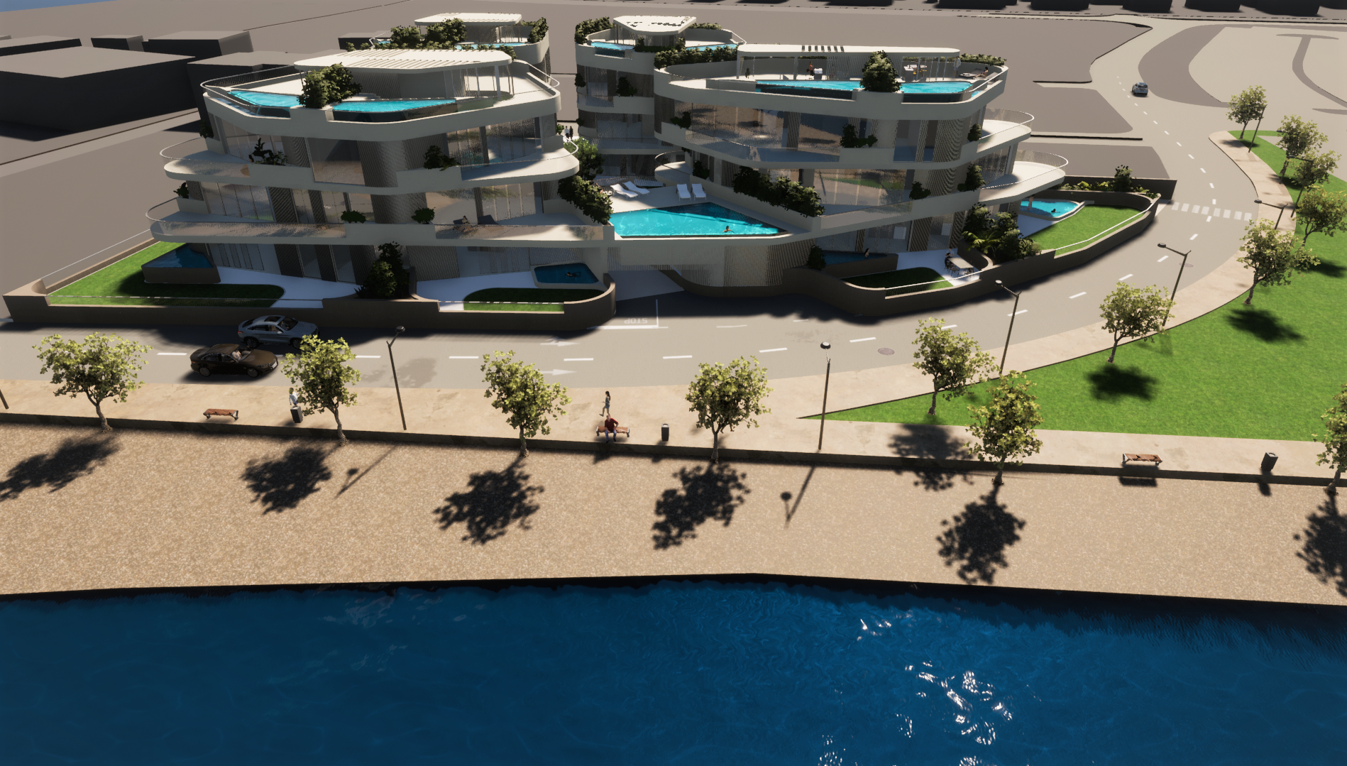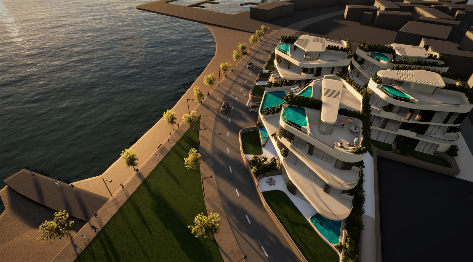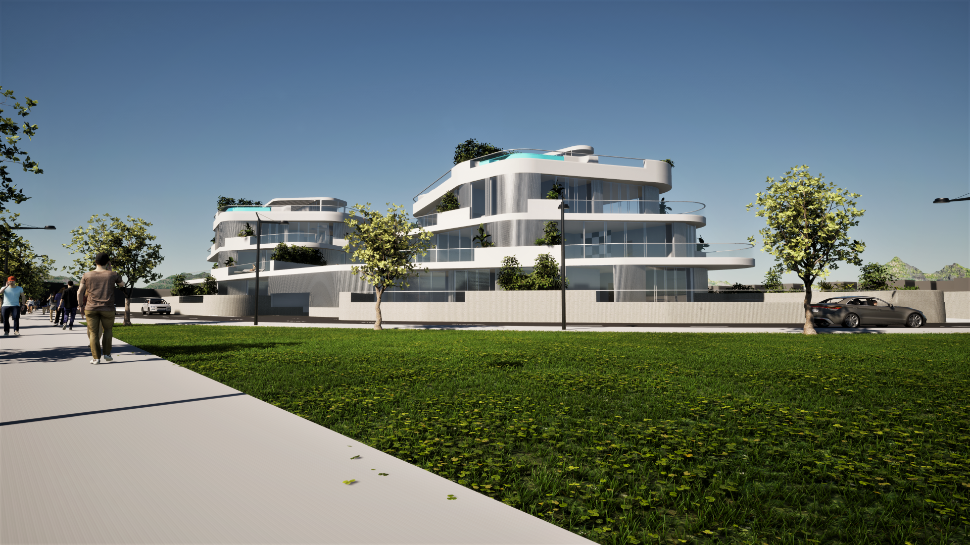 Stanovi u prizemlju imat će terasu ili loggiu te dvorište, a neki i bazen ili jacuzzi. Stanovi na prvome katu imat će velike terase te će imati pristup zajedničkom bazenu na platou. Po želji klijenta, mogući su i dodatni bazeni ili jacuzziji u stanovima na prvome katu.