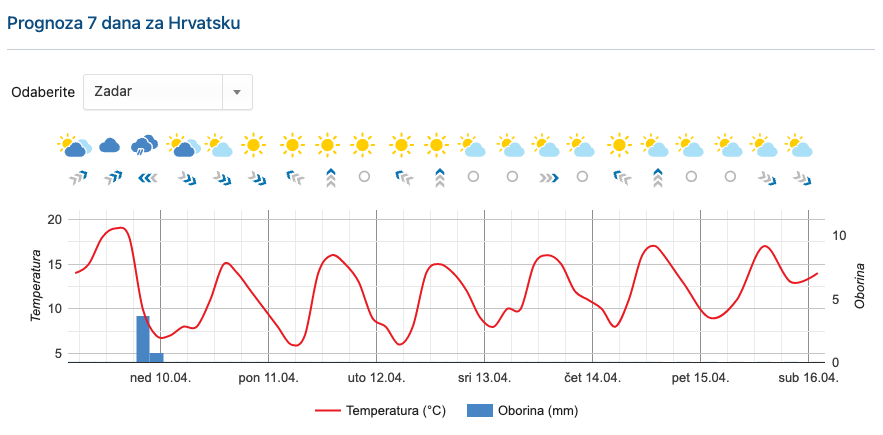 Još u nedjelju poslijepodne je moguće i malo kiše. Sjeverni vjetar će slabjeti, a naoblaka će se kidati pa će vedrina neba i dotok hladnog zraka početkom novog tjedna donijeti prilično hladno jutro, uglavnom u gorju i blage minuse, a mjestimice i mraz. Temperatura će brzo rasti pa će već od utorka tijekom dana biti 20-ak stupnjeva.