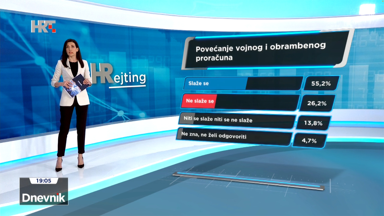 Više od polovine ispitanika, njih 55,2%, slaže se s prijedlogom da Hrvatska poveća izdvajanja za obranu i vojsku. Ne slaže se pak njih 26,2%. Niti se slaže, niti se ne slaže gotovo 13,8% ispitanika, a mali postotak (4,7%) njih ne želi odgovoriti.