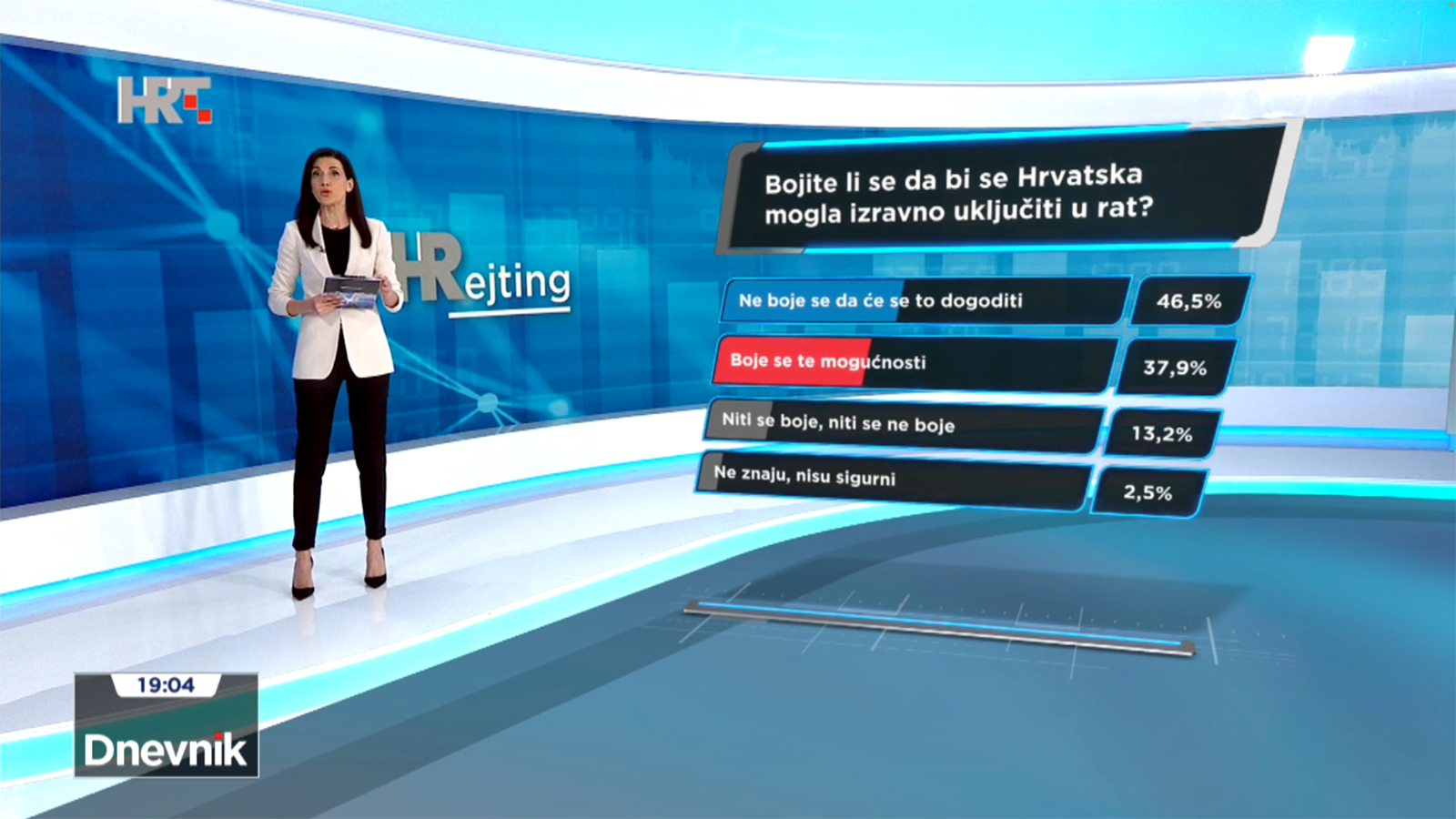 Na pitanje bojite li se da bi se Hrvatska mogla izravno uključiti u rat, 46,5% ispitanika se ne boji da će se to dogoditi, a 40% boji se te mogućnosti. Niti se boji, niti se ne boji njih 13%, a 2,5% nisu sigurni, pokazuje najnoviji HRejting, anketa provedena u vremenu od 16. do 19. svibnja na uzorku od 1400 ispitanika s najvećom pogreškom +- 2,62% dok je pouzdanost istraživanja 95%, a čiji su rezultati objavljeni u središnjem Dnevniku HTV-a.