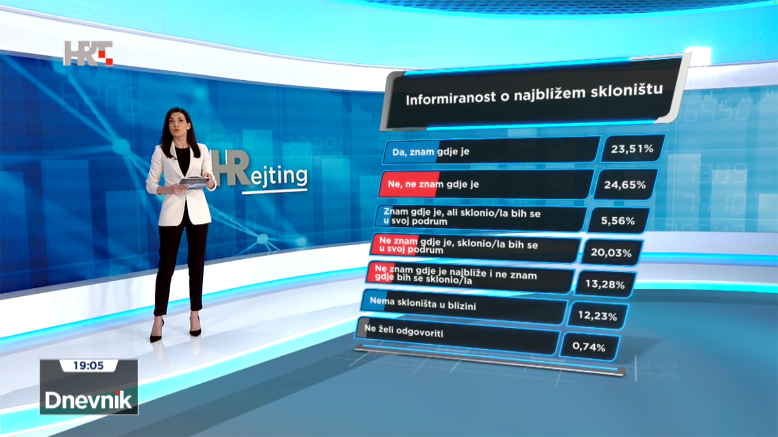 Što se tiče informiranosti o najbližem skloništu, oko 24% zna gdje se nalazi najbliže sklonište, a podjednak postotak to ne zna. Gotovo 6% zna, ali kaže da bi se prije sklonili u svoj podrum. 20% ne zna gdje im je najbliže sklonište i sklonili bi se u svoj podrum. Oko 13% ispitanih ne zna gdje je najbliže sklonište i ne zna gdje bi se sklonili, a njih 12% kaže da nema skloništa u blizini, prenosi Tportal.
